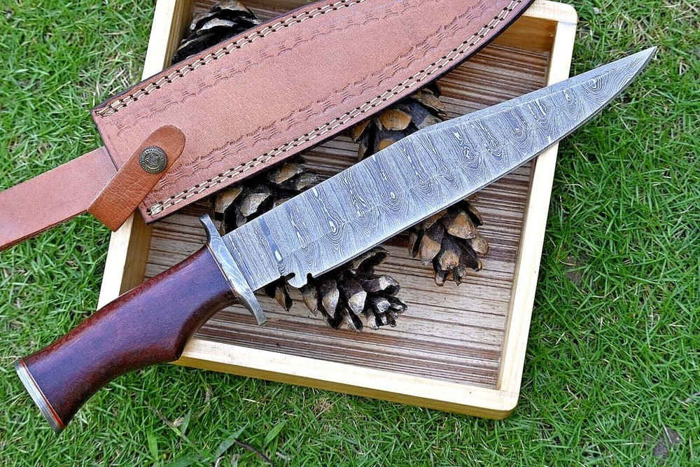 Introducing our exquisite Hunting Bowie Knife, a testament to craftsmanship and functionality. This knife features a formidable Damascus steel blade, known for its sharpness and durability, making it ideal for hunting and outdoor use. The handle is crafted from luxurious Rosewood, offering a comfortable grip and elegant aesthetics. A Damascus guard adds both style and protection. With an impressive overall length of 16 inches, this knife is a versatile tool for a range of outdoor tasks. Complete with a premium leather sheath, this Hunting Bowie Knife is the perfect companion for your outdoor adventures.