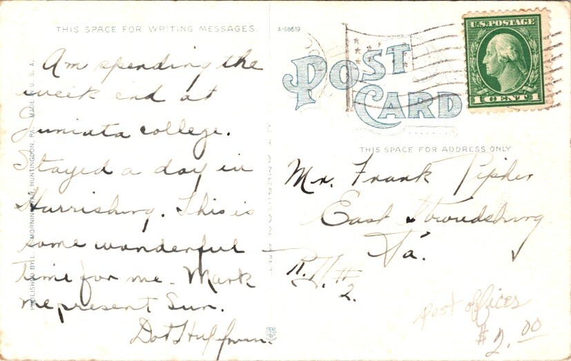 City:HuntingdonEra:White Border (1915-1930)Unit of Sale:Single UnitCountry:United StatesSubject:Post OfficePostage Condition:PostedContinent:North AmericaOriginal/Licensed Reprint:OriginalType:Printed (Lithograph)Number of Items in Set:1Region:PennsylvaniaMaterial:PaperTheme:Architecture, Cities & Towns, Community Life, Domestic & Family Life, Occupational, Patriotic, FlagCountry of Origin:United States