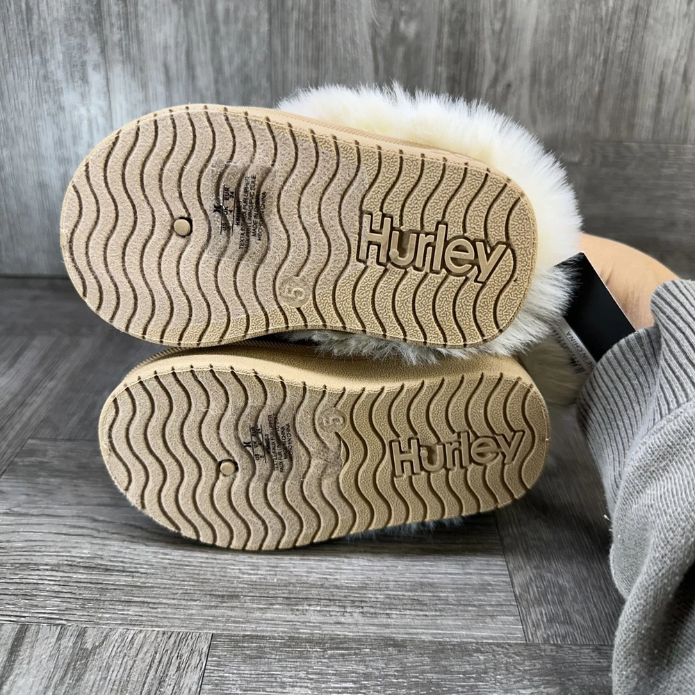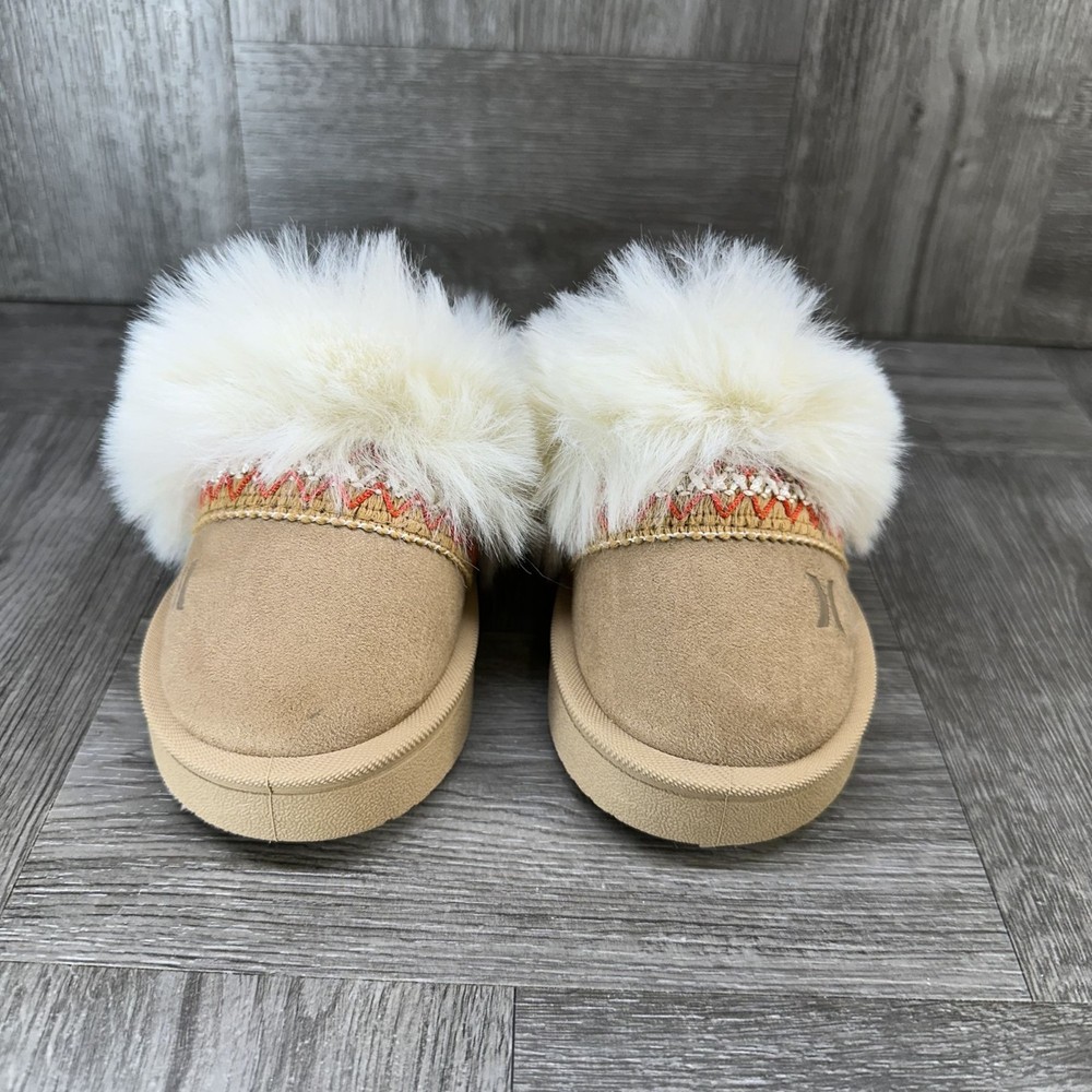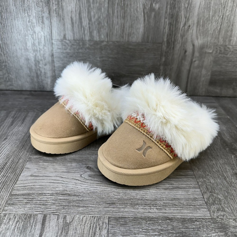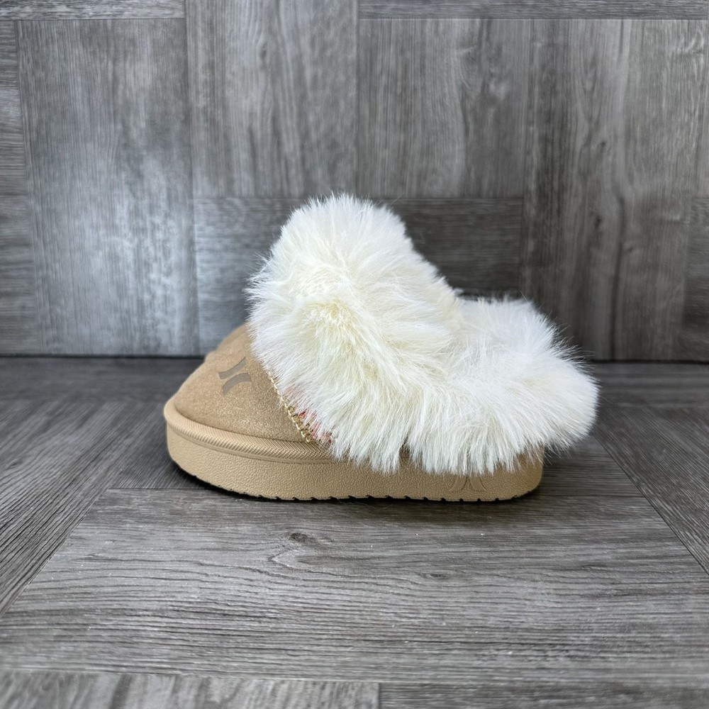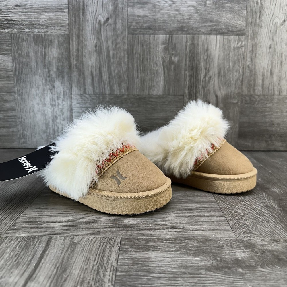The Hurley Kimmie Toddler size 5 Tan Cozy Slip On Slippers are unisex baby and toddler slippers perfect for keeping little feet warm and comfortable. Made with suede material, these slip-on slippers feature a cozy design that is easy to put on and take off. The tan color adds a versatile touch to any outfit, making them a stylish and practical choice for your little one.