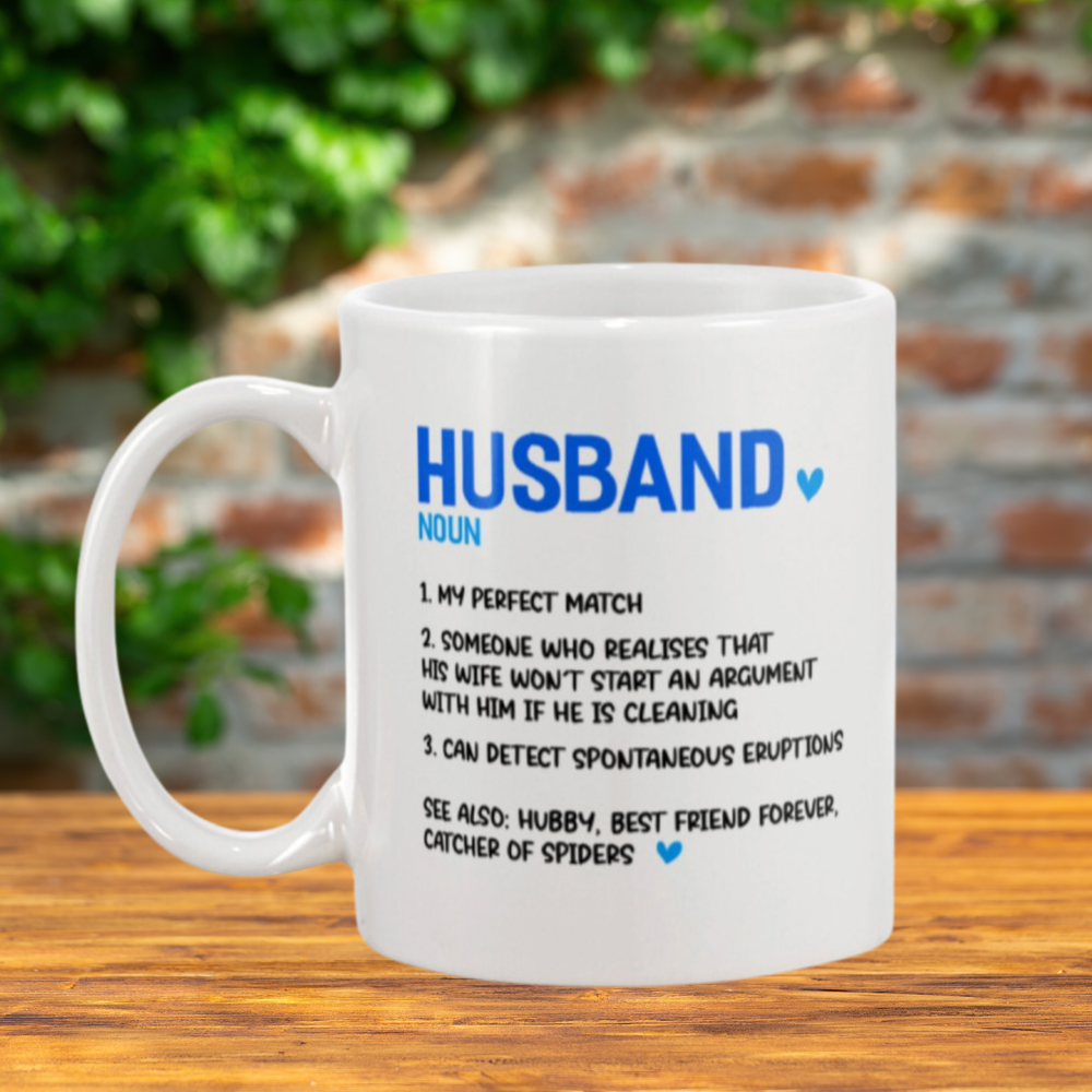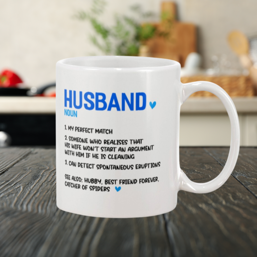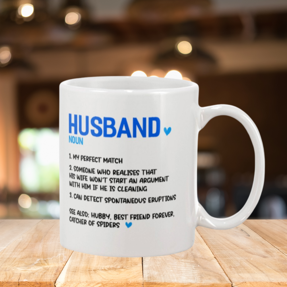 🎁 For the Perfect Husband Who Knows How to Keep the Peace 🌟 This 11oz white ceramic mug is the perfect gift for the husband who understands the secret to marital bliss: a little cleaning goes a long way! The humorous definition of "Husband" reads: "1. My Perfect Match 2. Someone who realizes that his wife won't start an argument with him if he's cleaning." πŸ’– Features: Material : Durable high-quality ceramic Capacity : 11oz – perfect for his morning coffee, tea, or favorite beverage Design : Bold and funny text, printed with vibrant colors Care : Microwave and dishwasher safe for ease of use 🎁 Great for : Anniversaries Birthdays Valentine's Day Just because πŸ’‘ Give this playful mug to the husband who knows how to win at marriage (by helping out around the house)!