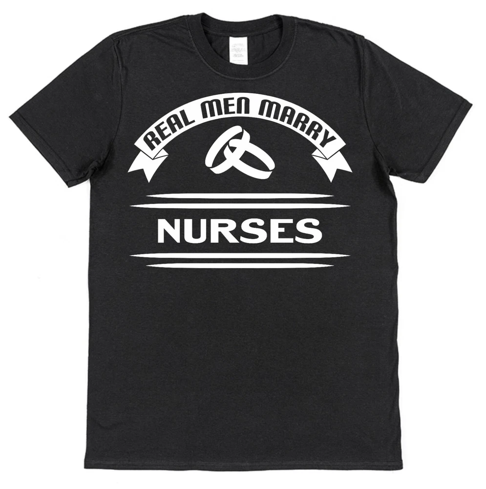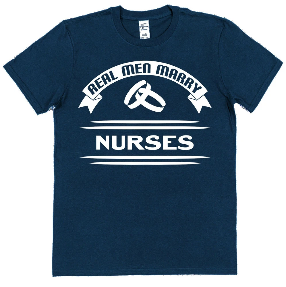 Funny Husband T-Shirt 'Real Men Marry Nurses' Brand new 100% cotton. Funny novelty T-shirts make fantastic Christmas presents for couples. This Hubby T-shirt is a unique Valentine's Day gift, anniversary present from a nurse wife or wedding present for the groom. Why purchase your T-shirts from Click My Clobber? Our classic regular fit T-shirts are 100% cotton so are comfortable and breathable. They've been made to last with re-enforced seams to eliminate separation and double stitched hem and sleeves for durability. At Click my Clobber, we're specialists in high quality T-shirt printing of cool unique tee’s for men. We give you a comfortable product that will last and last and stay looking great wash after wash. T-shirts like this one make stocking fillers, Christmas presents and birthday gifts. Check out our store, we have something for everyone's taste. T-shirt shopping has never been easier! Important Size Information: Small - Width 46cm, Length 71cm (To fit 34''-36'') Medium - Width 51cm, Length 74cm (To fit 38''-40'') Large - Width 56cm, Length 76cm (To fit 42''-44'') XL - Width 61cm, Length 79cm (To fit 46''-48'') 2XL - Width 66cm, Length 81cm (To fit 50''-52'') 3XL - Width 71cm, Length 84cm (To fit 54''-56'') Width is measured across garment 1cm down from armholes Length is measured from highest point of shoulder to bottom edge of garment. Please feel free to contact us if you have any questions or if you can't find what you're looking for. We always do our best to help.