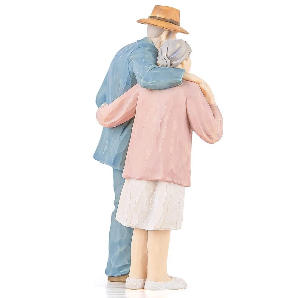 COUPLE FIGURINE: The years have passed, but my feelings have not changed. To the world you may be the person, but to person you may be the world. Sometimes love can not be expressed in words, use this romantic couple statue to express your gratitude to him/her GIFT FOR LOVER: A precious memory gift for lover . It is luxury gift for wife, girlfriend, sweetheart, husband, grandma, grandpa, dad, mom as birthdays gifts, anniversary gifts, Christmas gifts, mother day gift, father day gift, wedding gift etc. The hand-painted couple gift for grandma figure is comes with the fitted box ready for gift-giving. MATERIAL & SIZE: it is made of high-quality natural resin, Hand-polished by our professional designers and painted by hand. extremely durable and long lasting. The size is about 7*3.5*3inch. COLLECTION STATUE: An expression of love and caring, This hand-painted love figure through unique appearance to represent an emotion or mark a memory, closeness, healing, courage, hope, express love, all the emotions of a life well lived. This sculpted hand-painted love statue is a perfect ornament ready to display on a shelf, table, or mantal. ROMANTIC GIFT: Hand-painted resin figure of an old couple standing with support by the arms around. Wife in a cream dress, husband in a cream shirt, dark blue suit, and pants, on crutches. Elegant shape, lifelike expression details, the gift for a wife with finely crafted details everywhere. DESIGN INSPIRATION: This sculpture is made of high-quality materials and exudes sophistication and visual appeal. Its artistic design is finely detailed and expertly crafted, making it a beautiful piece. Its deep meaning inspires longing and respect for love, making it an excellent decorative work in 's home. In conclusion, the elderly couple sculpture you have designed is a stunning work of art that not only offers visual enjoyment but also provokes thought and contemplation. If you enjoy this sculpture, consider displaying it in your home and sharing your life with it.