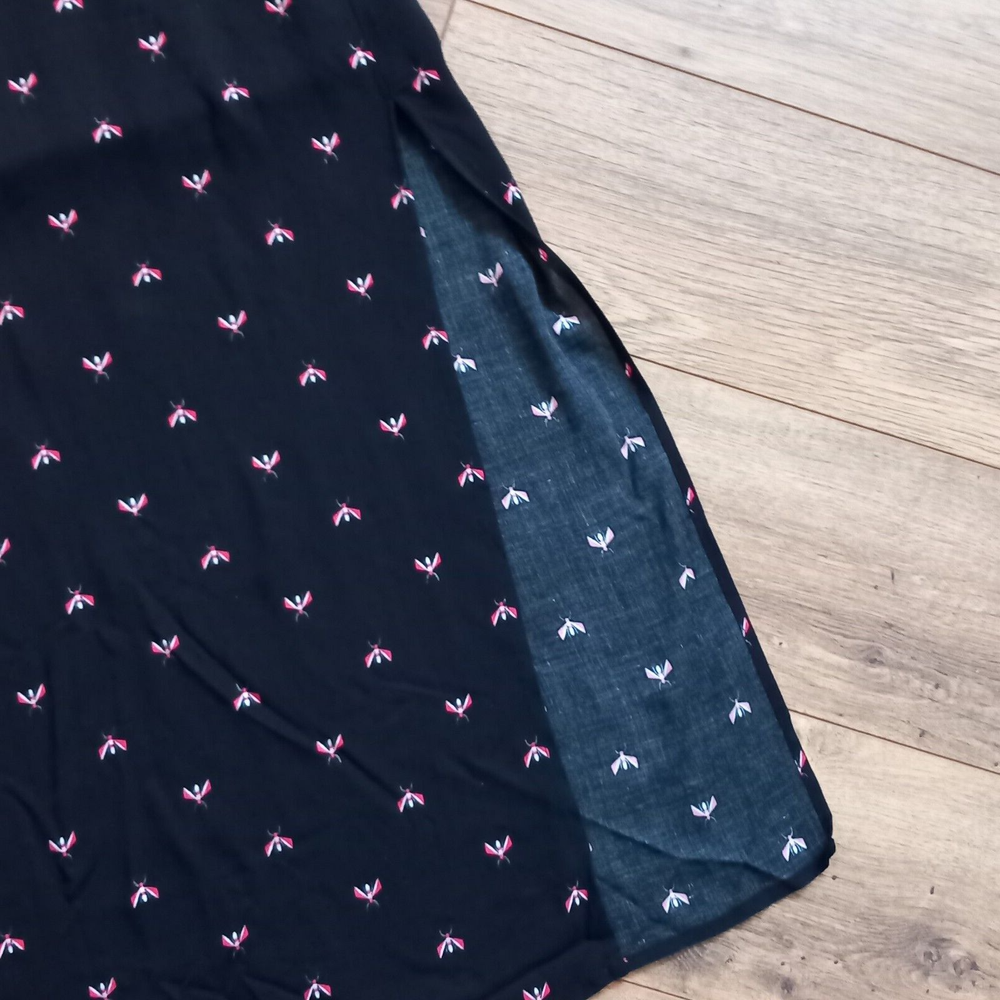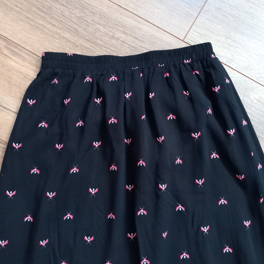 Gently used condition with no faults found. Fab flying insect pattern on black long side split skirt from HUSH. Measures 12" across elasticated waist area which goes up to 14" approx, 18" across hip area approx, 40" long. Part lined. Viscose.