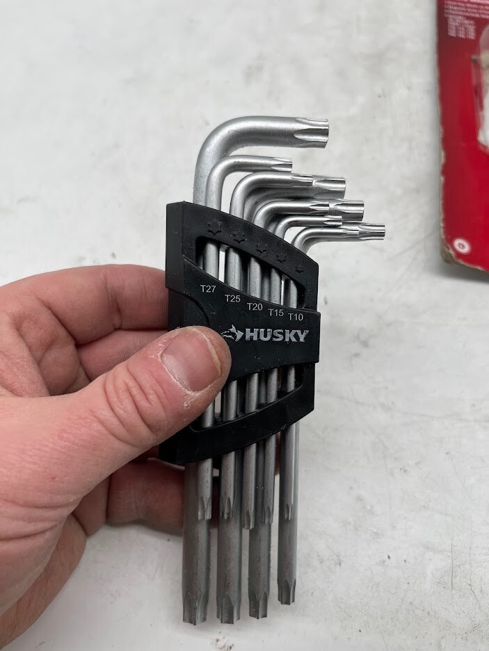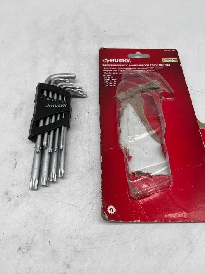 The item is new, unused. Listed as open box due to the fact there is some packaging distress. The Husky 9-Piece TORX L-Key Set is a versatile and durable solution for handling a wide range of TORX and tamperproof TORX fasteners . Designed for precision and strength , this set includes nine commonly used sizes and features a magnetic long arm for standard TORX fasteners and a short arm for tamperproof TORX applications . Key Features: Includes 9 TORX Sizes: T10, T15, T20, T25, T27, T30, T40, T45, and T50. Dual-Function Arms: Magnetic long arm for standard TORX fasteners; short arm for tamperproof TORX. Chamfered Ends: Helps guide the key smoothly into the fastener. Laser-Etched Size Markings: Easily identify the correct key for the job. Plastic Storage Caddy: Keeps keys organized and easily accessible. S2 Tool Steel Construction: Provides exceptional durability and strength . Satin Chrome Finish: Resists corrosion for long-lasting performance. Rotational Distortion Resistance: Maintains shape and prevents bending under pressure. Meets or Exceeds ANSI Standards for professional reliability. Perfect for automotive, machinery, and household applications , the Husky 9-Piece TORX L-Key Set ensures efficiency, durability, and easy access to essential TORX fastener sizes. We take great care to inspect all items and ensure they are accurately described. Should you have any issues with your purchase, please let us know immediately. We are committed to resolving any concerns promptly and to your satisfaction. Our small business truly appreciates your patronage.