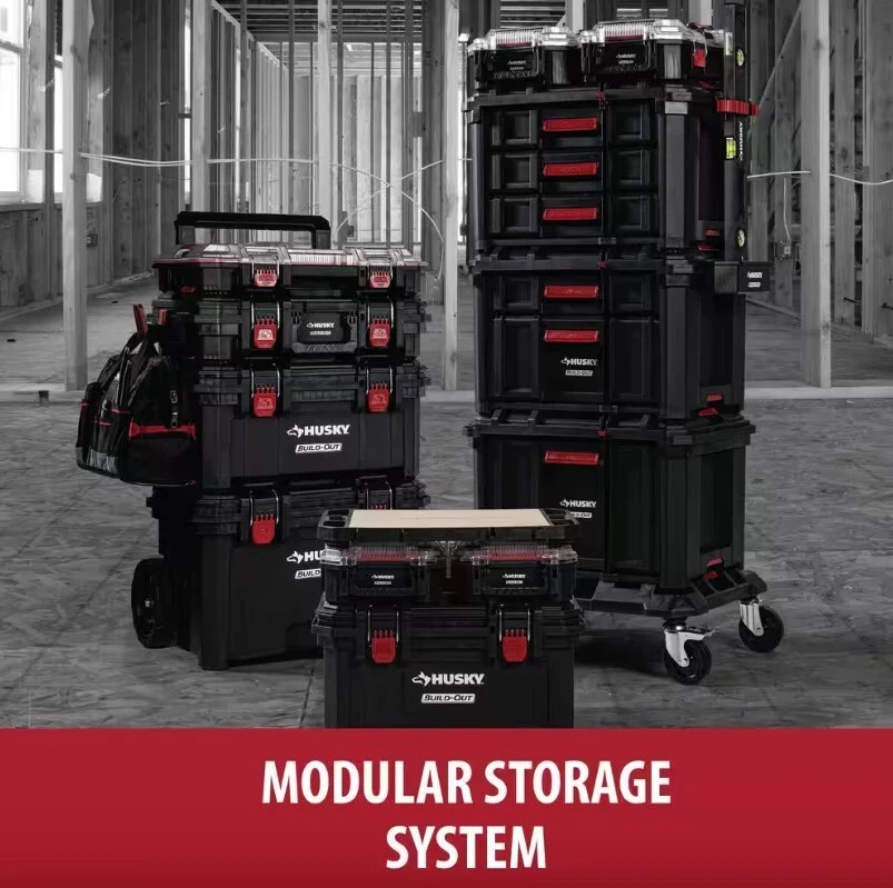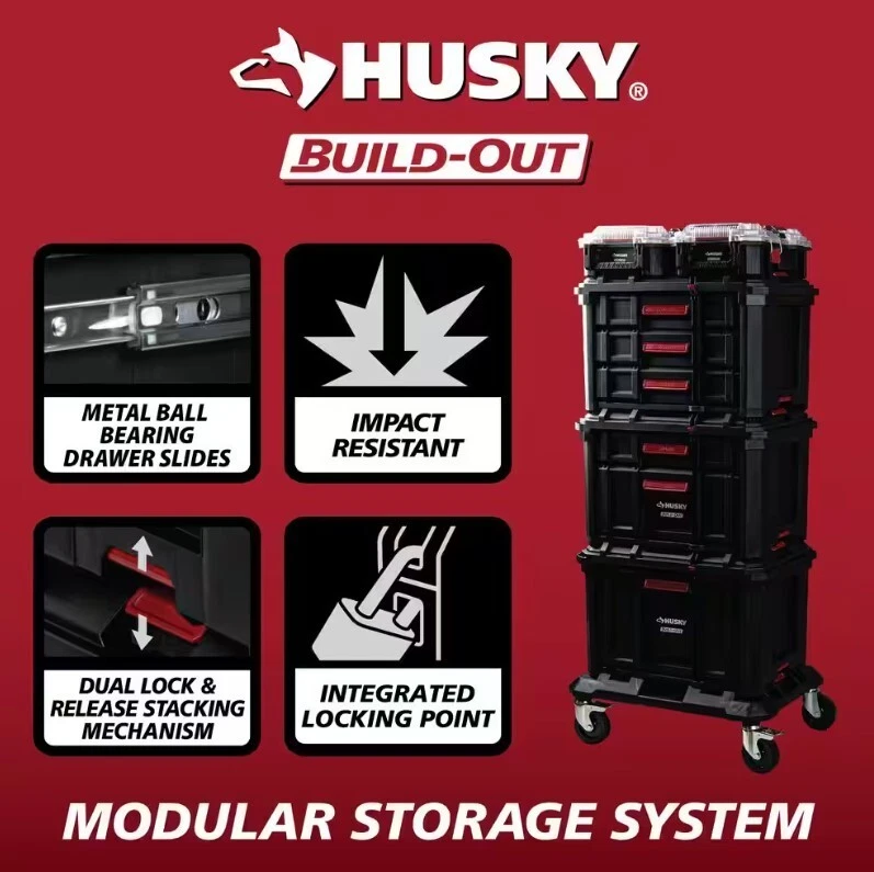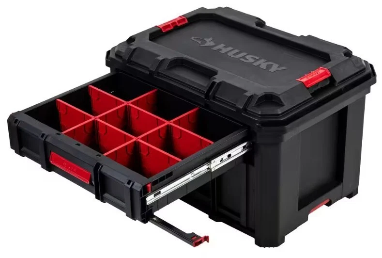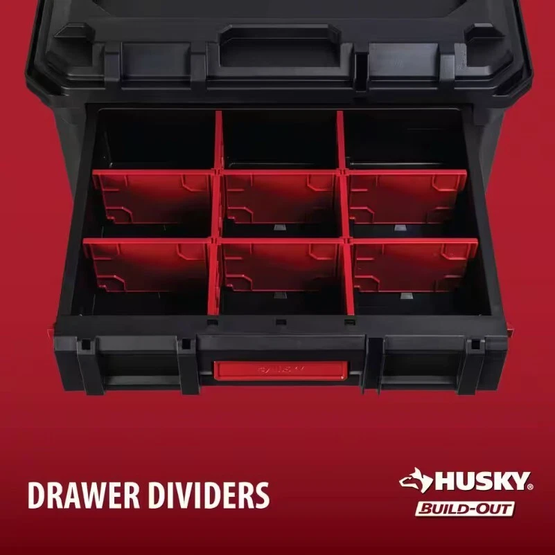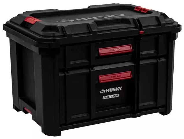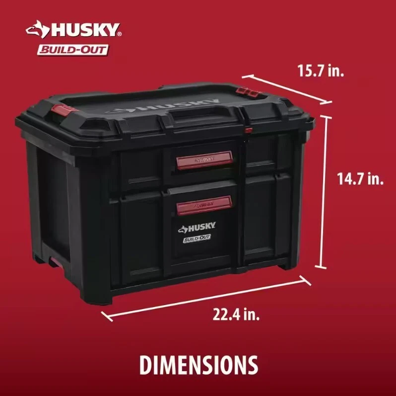 - NOTE: PLEASE READ PRODUCT DESCRIPTION CAREFULLY BEFORE PURCHASING. - NOTE: NO DELIVERY TO FREIGHT FORWARDING COMPANY ADDRESSES AND WAREHOUSE, BUSINESS ADDRESS, THE UPS STORE, UNITED STATES POSTAL SERVICE. - NOTE: WE DO NOT WORK ON SATURDAY AND SUNDAY. YOUR ORDER IS PROCESSED IN A MAXIMUM OF 10 BUSINESS DAYS, EXCLUDING SATURDAYS AND SUNDAYS. - NOTE: ORDERS TAKE A LONG TIME TO PROCESS, IF YOU CAN'T WAIT, YOU CAN SUBMIT A CANCELLATION REQUEST AT ANY TIME WHILE THE ORDER HAS NOT BEEN SHIPPED. - NOTE: DO NOT BUY MULTIPLE PRODUCTS IN THE SAME ORDER. PLEASE BUY EACH PRODUCT AS ONE ORDER. Husky Build-Out 22 in. Modular Tool Storage 2-Drawer Tool Box About This Product Get quick front access to your equipment with the Husky Build-Out 2-Drawer Tool Box. Each drawer has an independent latching mechanism to stop unwanted opening during transport. The top drawer includes configurable dividers to keep your tools and projects organized. The deeper bottom drawer is perfect for oversize tools and components. With heavy-duty metal ball bearing slides and impact-resistant construction, this drawered unit features a total loading capacity of 50 lbs. The built-in pass-through security feature with included metal security bar ensure your tools stay safe and secure. Expand your storage system by connecting hooks and other accessories to the integrated accessory rail. The Husky Build-Out system creates customizable modular storage that gets you and your tools to the job site faster. The system includes tool boxes organizers, crates and accessories, all designed to seamlessly secure together in many different configurations. Highlights Impact-resistant construction 1806 combined total cubic inches of storage 50 lbs. total load capacity Independent drawer latching mechanism Dual lock and release stacking mechanism provides a secure connection between each individual build-out component that quickly aligns and releases Heavy-duty metal ball bearing drawer slides Integrated accessory rail for easy attachment of additional build-out accessories Built in pass-through security feature allows for all components to be secured together with a cable lock or any standard 1 in. padlock Includes metal security bar with dedicated in-drawer storage