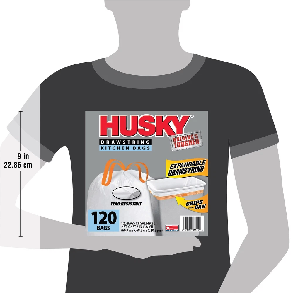Husky 13 Gallon Drawstring Unscented Tall Kitchen Bags resist tears and punctures so you can transport your kitchen waste to the curb with confidence. These 24 inch by 27 inch kitchen bags fit most standard-size kitchen trash cans. Manufactured with high quality expandable drawstring which grips the can, keeping it in place. 120 bags per box. Manufactured with 20% post-consumer recycled content. Husky 13 gal 120 count 24" x 27" 0.8 mil thickness One-by-One dispensing Unscented Manufactured with 20% post-consumer recycled plastic Great for residential, indoor trash
