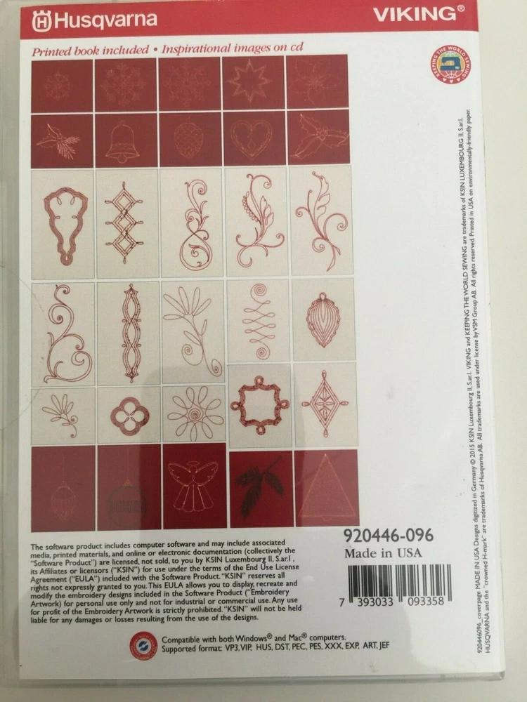 Husqvarna Viking Specialty Bobbin Case Embroideries Collection 296 #920446-096 New Description Lovely embroideries combined with the specialty bobbin case, allows you to create boundless versions of each design. It is perfect for embellishing garments and home decor items. Create wonderful Christmas motifs to add to your current collection. Instructions for the Christmas wall hanging is on the CD. The specialty Bobbin Case is sold as an accessory. Compatible hoop sizes: 100mm x 100mm, 240mm x 150mm File Formats: VP3, VIP, HUS, DST, PECM PESM XXX, EXP, ART, JEF All designs are not compatible with all sewing systems. Check your hoop size before purchasing. RETURN POLICY: Returns will only be accepted if the item is in brand new condition with the original packaging that it was sent to you. If the item has been used it will not be accepted as a return. WE DO OFFER COMBINED SHIPPING IF YOU USE THE CART. WHEN YOU USE THE CART THE SHIPPING WILL BE AUTOMATICALLY COMBINED AND DISCOUNTED FOR YOU.