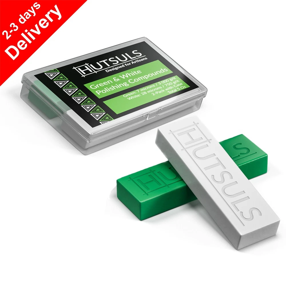 Hutsuls White & Green Strop Compound - Total 5 Oz Get Razor Sharp Edge with Green Honing Compound for Strop, Easy to Use Green & White Stropping Compound for Knives Guide, White Polishing Compound Bar Razor-Sharp Edges: Keep your blades extra sharp with a knife polishing compound set. Use white & green polishing compound bar for honing axes, chisels, broadheads, plane blades, pocket & chef's knives Easy to Use: Using this leather strop polishing compound set is a breeze. This is for professional & beginner use. Includes a step-by-step metal polishing compound stainless steel how-to-use guidance Will Last Years: The fine white aluminum oxide paste and extra fine green aluminum & chromium oxide strop paste in wax bars go a long way in providing years of use. Great value 2 bars, a total of 5 Oz Works Great: White & green buffing compound bars are fast and effective for polishing to a mirror finish. Because of their economy and practicality, wax bars are a go-to format for many sharpeners Easy to Store & Protect: In leather strop compound set is included a functional plastic case. Good sealing prevents green & white strop compound from over-drying, dust, moisture & keeps them organized A Secret to Razor-Sharp Blades If you are seriously into wood carving, you need to keep your knives razor-sharp, and if you are a real artisan, you won’t settle for less than mirror-like blades. That’s just what Hutsuls’ knife strop compound does — it helps you get extremely sharp edges and smooth surfaces with no sweat. Centuries-Long Leather Stropping Tradition The manufacturing of our strop buffing compound is based on the many centuries of experience and professional secrets of Hutsuls, an ethnic group of western Ukraine famous for its wood craftsmanship. With the knowledge passed through the generations of artisans, we know how to hone blades faster and better using high-quality leather strop polishing compound. Our expertise and the quality of Hutsuls’ products are verified by more than 100,000 happy clients around the world. Multipurpose Stropping Compound for Knives and Cutting Tools You don’t have to puzzle over compounds needed to restore the sharpness of your blades anymore. Our set includes abrasives most appropriate for honing and polishing a vast variety of tools: • woodworking tools (wood carving knives, chisels, hand planes) • sports and hunting equipment (folding knives, fish hooks, broadheads) • kitchen knives (chef’s knives, cleavers, kitchen shears) • garden tools (axes, shovels, garden shears) • camping gear (bushcraft knives, hatchets, camping axes) • razors, pocket and utility knives Apply the coarser white stropping compound first to remove deep scratches from soft metals, sharpen dull blades, and give a nice final finish to harder materials. Get on with the extra fine green strop compound to enjoy supreme luster on hard and soft metals. You can use each compound for strop and wheel polishing — just rub it on the heated strop surface or press it against the spinning wheel, and you are ready to go. A Greate Choice for Strop Polishing Compound At a very reasonable cost, you get a money-saving solution for all your sharpening jobs: • 2.5 Oz green polishing compound bar for glossy buffing; • 2.5 Oz white stropping leather compound for cutting and polishing; • a plastic storage case to prevent the compounds from drying out and retain their properties for longer; • step-by-step instructions explaining when and how to use the aluminum oxide bar or the chromium oxide strop paste for the best possible results. The Hutsuls white and green rouge set helps you to keep your cutting tools sharp and ready with a little time and effort spent!
