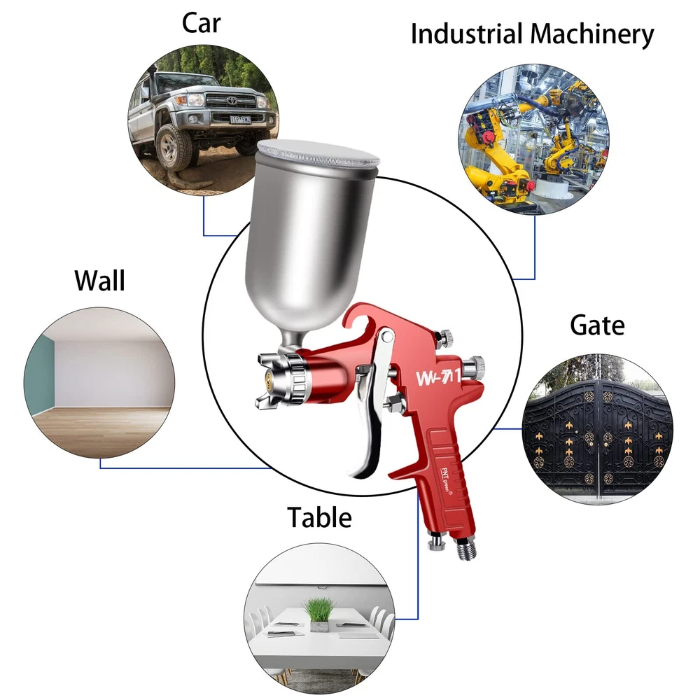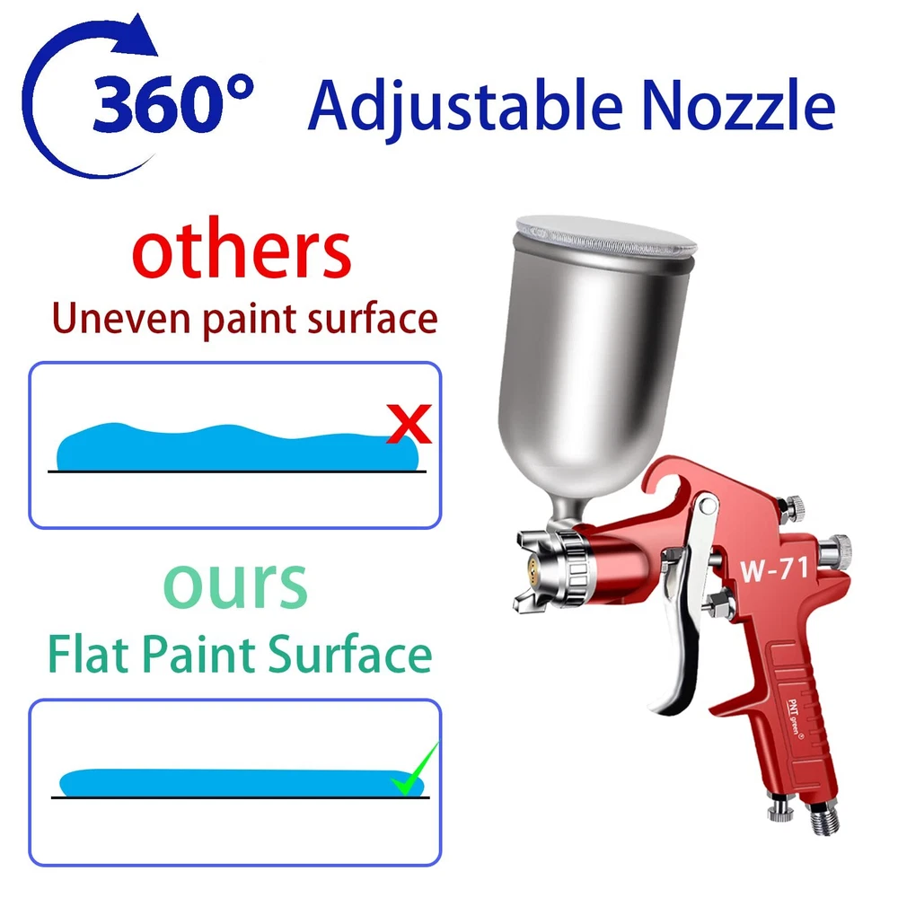 【SPECIFICATIONS】Type of Feed: gravity / Fluid Nozzle:1.5 mm / Air pressure: 3.45 bar (50 PSI) / Air consumption:11 cfm / Paint Capacity:400 CC / Air Inlet:1/4" 【HIGH QUALITY】air compressor spray ’s ergonomic designed handle for comfortable grip. Easy trigger reduce operating fatigue. Simply operate to touch up or painting. 【ADJUSTABLE】Three adjustment valve can flexibility to adjust the liquid volume/ air volume/ spray range to meet your various usage needs, such as car、wall、wood、metal、leather. 【400ML PAINT CUP】400CC detachable gravity feed cup, minimizes waste of paint in the cup and removable for easy cleaning. 【360°ADJUSTABLE NOZZLE】1.5mm stainless steel nozzle, Brass Airflow Cap, nozzle direction can be adjusted 360°by adjusting the nozzle cap, stainless steel material is very durable and can spray most light to medium viscosity materials, used for automotive painting, household appliances, furniture, iron plate, aluminum, plastic, etc.