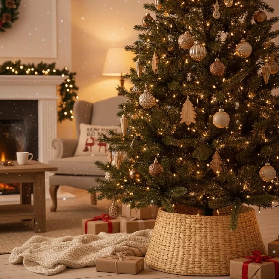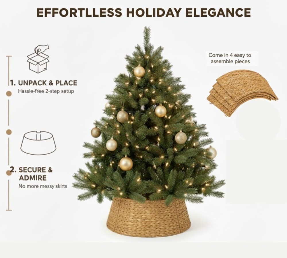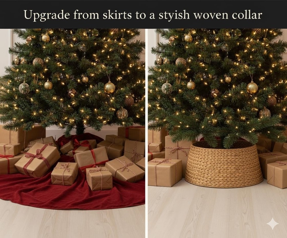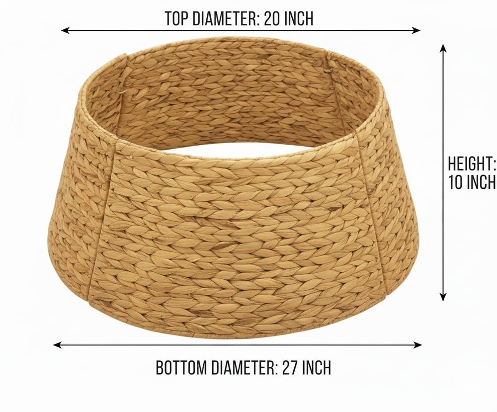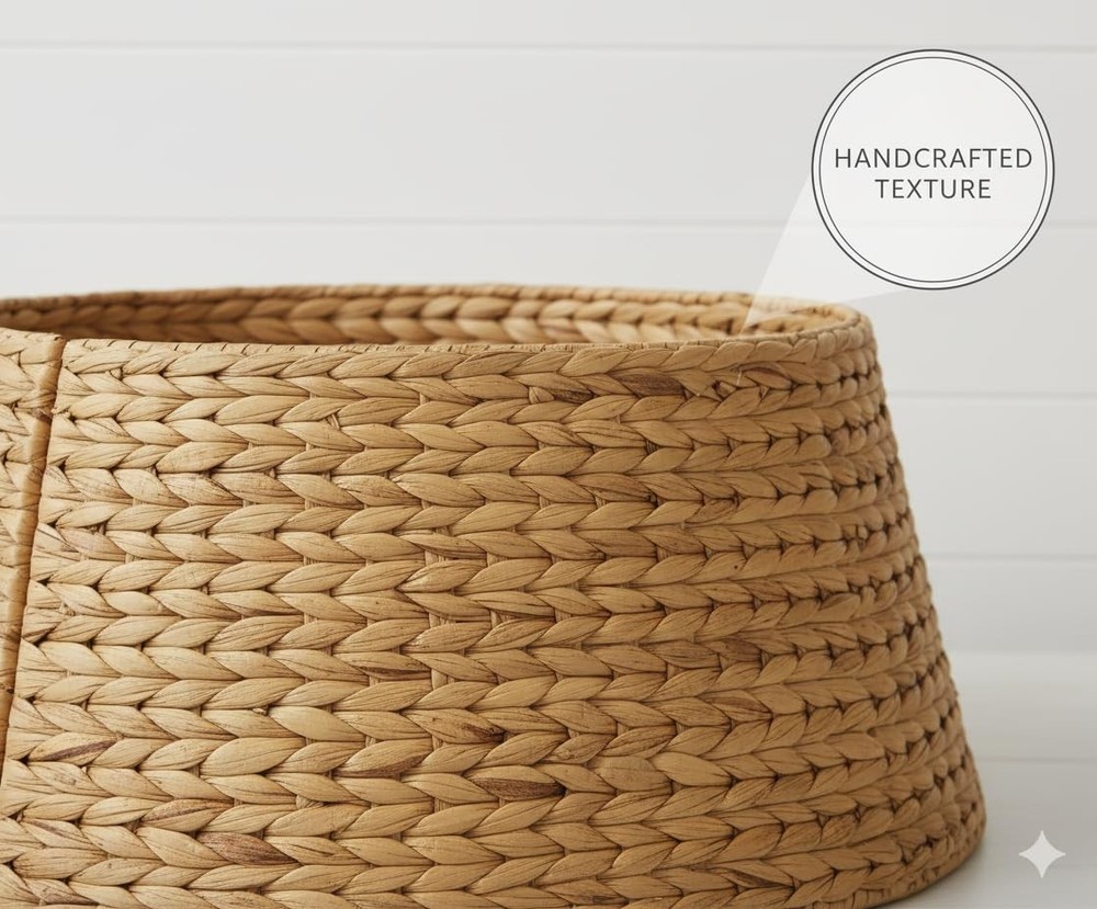 Add warmth, style, and a clean finish to your holiday décor with our Natural Water Hyacinth Christmas Tree Collar. Hand-woven from eco-friendly water hyacinth, this basket-style tree collar replaces traditional tree skirts with a more structured, elevated look. The natural texture and warm tones instantly create a cozy farmhouse or rustic feel in your home. Designed to fit most tree stands , this collar hides bulky metal or plastic bases and gives your tree a polished appearance from every angle. Lightweight yet sturdy, it sets up in seconds and stores easily after the holidays. Whether your décor style is , farmhouse, Scandinavian, or modern boho, this woven tree collar adds charm and warmth to your Christmas display. Make your holiday tree look beautifully finished — the easy, stylish way. Natural Hand-Woven Water Hyacinth – Crafted from durable, eco-friendly water hyacinth with a warm, rustic texture that instantly elevates your holiday décor. Each piece is hand-woven for a unique, organic look. Hides Tree Stands Cleanly & Beautifully – No more distracting metal bases or plastic tree stands. This structured collar provides a clean, polished look around your Christmas tree in seconds. Fits Most Artificial & Real Trees – Designed with a wide base opening and flared shape to accommodate most popular tree stands (6 to 9ft). Great for small, medium, and large trees. Farmhouse & Modern Rustic Style – Neutral warm tones blend seamlessly with farmhouse, Scandinavian, boho, traditional, or modern décor. Perfect for cozy holiday styling. Quick Setup & Easy Storage – Lightweight, sturdy, and simple to place around your tree. Collapses or nests for easy off-season storage without taking up space.