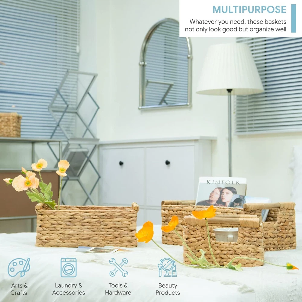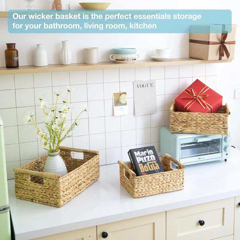 ✅ Wicker Storage Basket - Bring organic style coastal charm to your home! They're made by nature thick water hyacinth reeds create a large braided weave for beautiful and striking wicker. Crafted by hand of finely woven water hyacinth, the eye-catching natural baskets score extra points for being an organizational tool. ✅ Natural & High Quality - Our wicker baskets are made of Water Hyacinth in Vietnam by skillful Vietnamese artisans to provide years of durability and sustainability. A natural material with an iron frame for sturdy and durable basket storage. Wooden handles make it convenient to pull these off the shelf, out of cabinets and drawers, or wherever you store them. The sturdy handles make these ideals for upper shelves, you can use the handles to pull them down ✅ Decorative Wicker Baskets - Natural water hyacinth basket is an easy and affordable way to change the style of your home. With their natural design, the wicker basket makes nice neutral backdrops and can brighten your day as well as impress your guests. ✅ Functional & Versatile - Whether it be by way of pure decor, storage, or organization for kitchen, pantry, or bathroom, these natural woven baskets suit your home in every way. Place on the toilet tank, bathroom, entryway, dresser tops, or hallway tables. The basket is great for linens, towels, laundry needs, magazines, games, pet toys, media, household items. ✅ Set Of Three - (Large Basket) 15.5"L x 10.8"W x 6.2"H, (Medium Basket) 13.6"L x 9.5"W x 5.6"H, (Small Basket) 11.6"L x 8.1"W x 4.9"H. These wicker baskets can stack inside of each other allowing for convenient and easy storage when not in use and are convenient storage bins for drawers, shelves, desks, or in the house. Please note that these products are handmade and the sizes may vary ±1 inch. Product information Technical Details Material Water Hyacinth Color Water Hyacinth (Nested Set) Shape Rectangular Product Dimensions 15.5"D x 10.8"W x 6.2"H Style Rustic Room Type Pantry, Bathroom, Home Office, Entryway or Mudroom, Kitchen, Living Room, Bedroom, Nursery, Dining Room Recommended Uses For Product Home Decor; Organizing Essentials; Storage Solution, Storage, Craft Storage; Paperwork & Office Supplies, Wardrobe, Decoration Number of Pieces 3 Finish Type natural With Lid No Handle Material Wood Closure Type Open Top Special Feature Handle Item Weight 3.76 pounds Country of Origin Vietnam Size 1 Small, 1 Medium, 1 Large Finish natural Pattern Rectangular Handle/Lever Placement Sides Special Features Handle Usage Home Decor; Organizing Essentials; Storage Solution, Craft Storage; Paperwork & Office Supplies Batteries Included? No Batteries Required? No