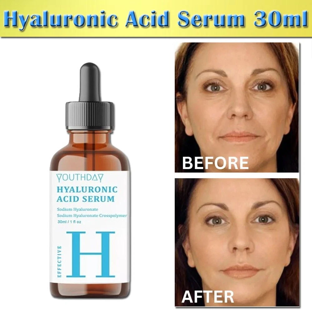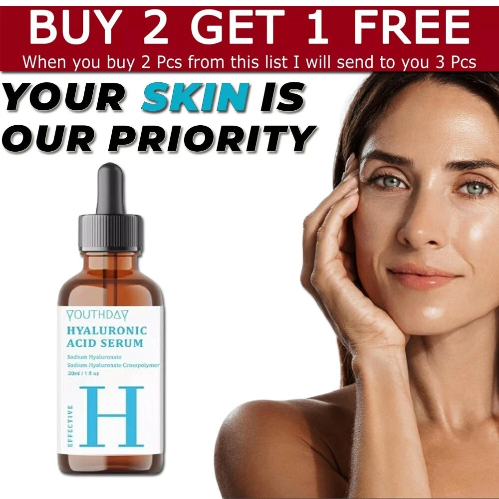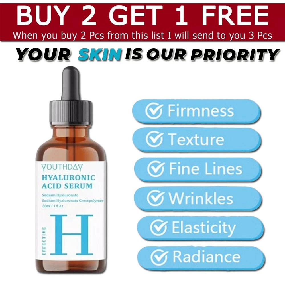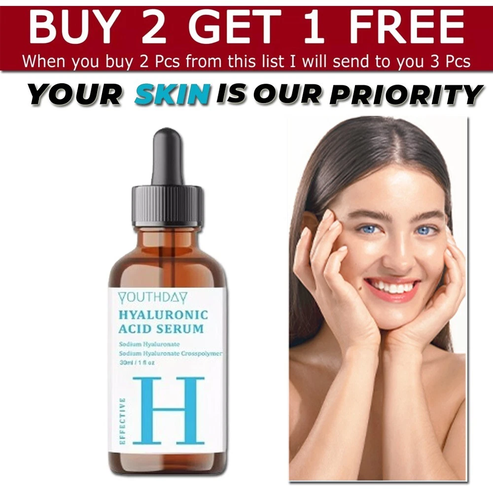 WHEN YOU BUY 2 PCS FROM THIS LIST I WILL SEND TO YOU 3 PCS Youthday Hyaluronic Acid Serum for Skin 100% Pure Anti Aging Serum Intense Hydrat ๐ง๐ข๐ฃ ๐ฎ๐ฌ๐ฎ 4 * Hyaluronic Acid Face Serum - 2.5% Pure Hyaluronic Serum + 3% B5, Anti Wrinkle + Anti Aging Serum for Face with Vitamin C & E, Aloe - Antiaging Hydrating Serum, Hylunaric Acid Serum Nuttrel Hydration Serum, Hyaluronic Acid Serum for Face, Deep Hydrating Serum - Delivers long-lasting hydration to help prevent future dehydration Hyaluronic Acid Serum, Non-Greasy Hydrating Face Serum with Pure Hyaluronic Acid, 1 oz / 30 ml Apply On All Skin Types Suitable for Men and Women Both Skin Care Use In Morning and Night ( AM/PM ) Looking Younger, Improve Skin Elasticity, Improve Skin Texture, Reduce Anti Aging, Wrinkles, Fine Lines, Gives Long Lasting Hydration. Hyaluronic Acid Serum, Made From Pure Hyaluronic Acid, Anti Aging/Wrinkle, Ultra-Hydrating Moisturizer That Reduces Dry Skin Manufactured By USA Formula. Note: This Product is designed to deliver optimal results, offering high-quality performance and satisfaction. Please note that individual experiences and outcomes may vary based on personal use, preferences, and unique circumstances. For best results, we recommend following the provided guidelines and ensuring the product is used as intended. Product result may vary for every individual.