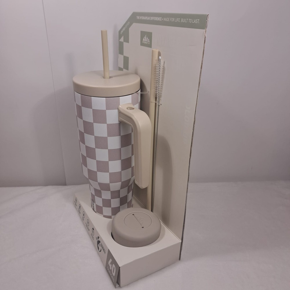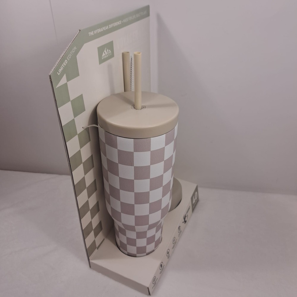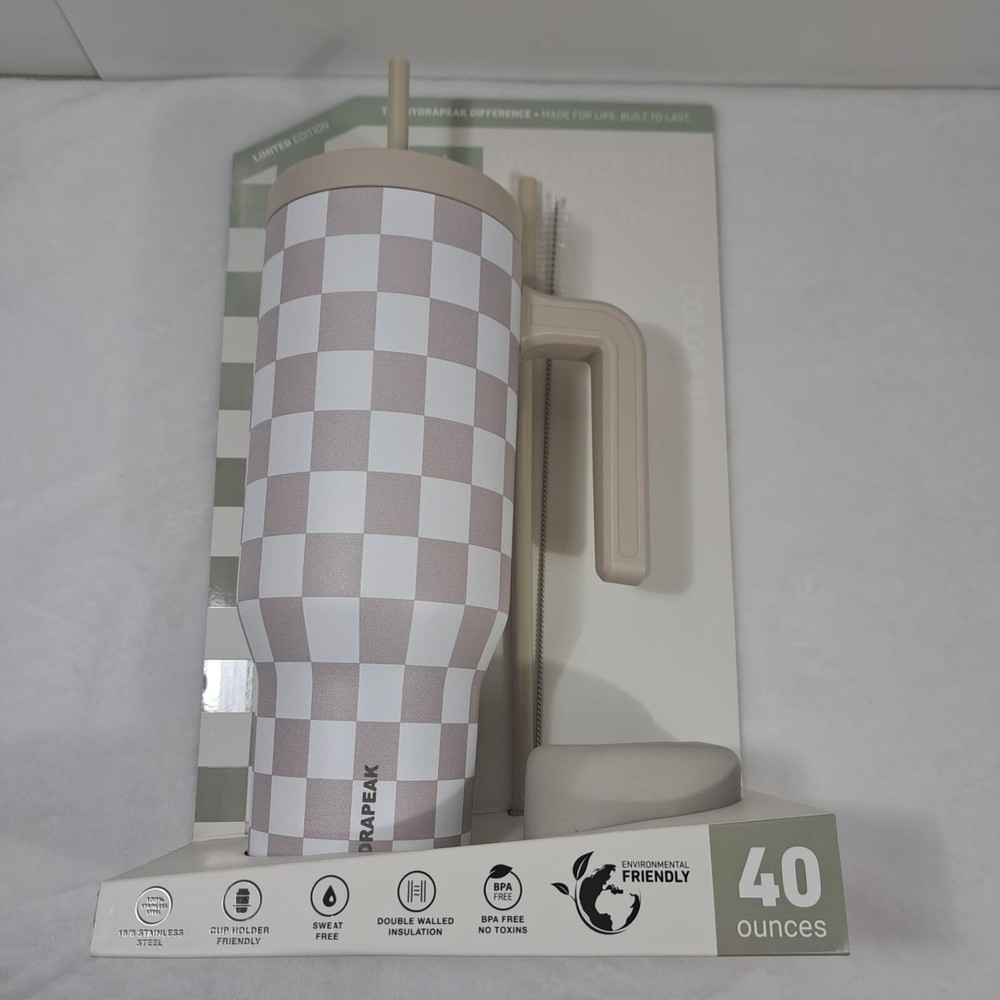 Introducing the Hydrapeak Voyager 40oz Steel Tumbler, a perfect combination of style and durability. This tumbler features a push cap top type and comes in a limited edition cream checkered design with a handle for easy grip. The tumbler is made of stainless steel material and is BPA-free, sweat-free, and reusable. It has a locking mechanism, refillable feature, and a double wall that ensures insulation. The tumbler also comes with a straw cleaner and protective silicone boot for added convenience. With a lifetime manufacturer warranty, this tumbler is a reliable choice for anyone on the go. Items are carefully inspected and sealed after photos. We carefully pack and ship out fast! We ship daily with one day handling