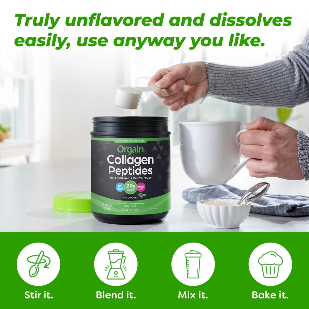 Why collagen, you ask? This ever-so-important protein is the most abundant protein in our bodies! It’s a key structural component of our joints, skin, tendons, muscles, and more. Why then, if it’s so prevalent, should you ? Well, like many good things, it’s doesn't last forever. As we age, our collagen levels begin to decline. This process begins in our 20’s and ramps up with time. A daily collagen replenishment is the key to feeling your best - inside and out! These magical grass-fed collagen peptides put the pep in your step, supporting strong nails, joints, and radiant skin and hair.^ Collagen Peptides are made with high quality, grass-fed and pasture-raised Type I and III collagen. Plus, with no artificial preservatives, allergens, gluten, dairy, wheat, or eggs, you can bet it’s clean. Collagen is odorless and unflavored making it easy to incorporate into your daily routine. Enjoy a couple scoops in your morning cup of coffee, your next bowl of oatmeal, a delicious smoothie, or even a batch of cookies! Collagen can be used in hot or cold foods and drinks, and prepped any way you fancy – stir it, blend it, mix it, bake it! Feel, move and look your best with collagen. ^These statements have not been evaluated by the Food and Drug Administration. This product is not intended to diagnose, treat, , or prevent any disease. FEEL, MOVE AND LOOK YOUR BEST: Supports Radiant Skin, strong hair and Nails, Joint function and , and mixes easily in any food or drink. CLEANER INGREDIENTS: Includes hydrolyzed grass-fed, pasture-raised bovine collagen peptides and essential amino acids: Lysine, Leucine, Histidine, Methionine, Isoleucine, Phenylalanine, Theronine, Valine HIGHER STANDARDS: Because we’re serious about clean, you can rest assured this product is made without lactose, dairy or soy ingredients, gluten free, has no sugar added*, Non-GMO, and contains no artificial flavors, preservatives, or colors. EASY TO MIX: Since it’s unflavored and dissolves easily, this collagen blend can be used any way! Hot or cold – stir it (we love it in coffee), blend it (protein shake, anyone?), bake it (a secret upgrade for that batch of cookies?). 20G COLLAGEN PEPTIDES PER SERVING: Every serving (2 scoops!) packs 20g of odorless and colorless Type I and III grass-fed, pasture-raised collagen hydrolysate peptides, essential amino acids and approximately 18g of protein. WHAT TO EXPECT: Includes 1 (1 Lb) ready to mix Collagen Peptides . Great for Women & Men.