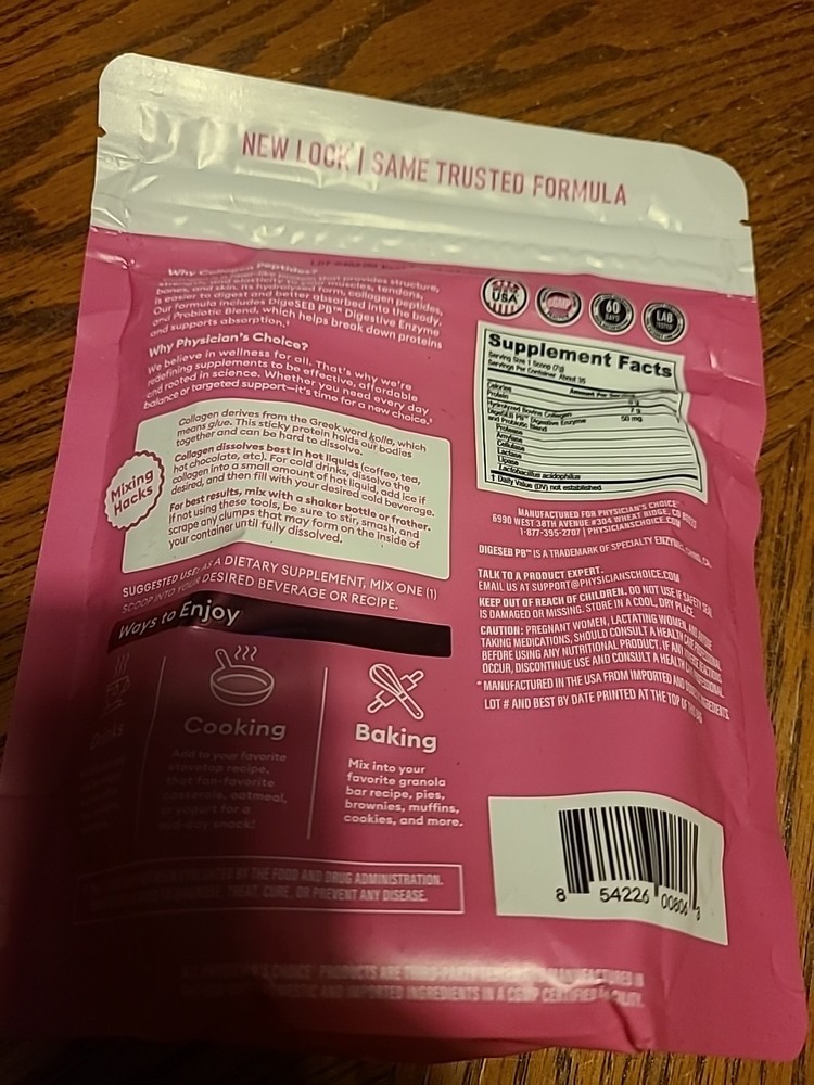 ISBN: 0854226008063 UPC: 854226008063 Serving Recommendation: 1 Scoop gtin13: 0854226008063 Item Package Quantity: 1 Active Ingredients: Collagen Type: Does not apply Customer Package Type: Standard Packaging Age Range Description: Adult Part Number: Phc00806 Diet Type: Keto Total Servings Per Container: 35.0 Ingredients: Collagen Peptides Powder, Digeseb Digestive Enzymes Flavor: Unflavored Item Form: Powder Material Feature: Gmo Free Weight: 0.57 Pounds Brand: Physician's Choice Model Number: Phc00806 Style: Pack Of 1 Dosage Form: Powder Fc Shelf Life: 730.0 Product Expiration Type: Expiration On Package Target Gender: Unisex Features: Hydrolyzed Formulation: Powder EAN: 0854226008063 Package Dimensions LxWxH: 5.87x3.74x3.66 Inches Unit Count: 8.67 Container Type: Canister Size: 35 Servings (Pack Of 1) Allergen Information: Gluten Free