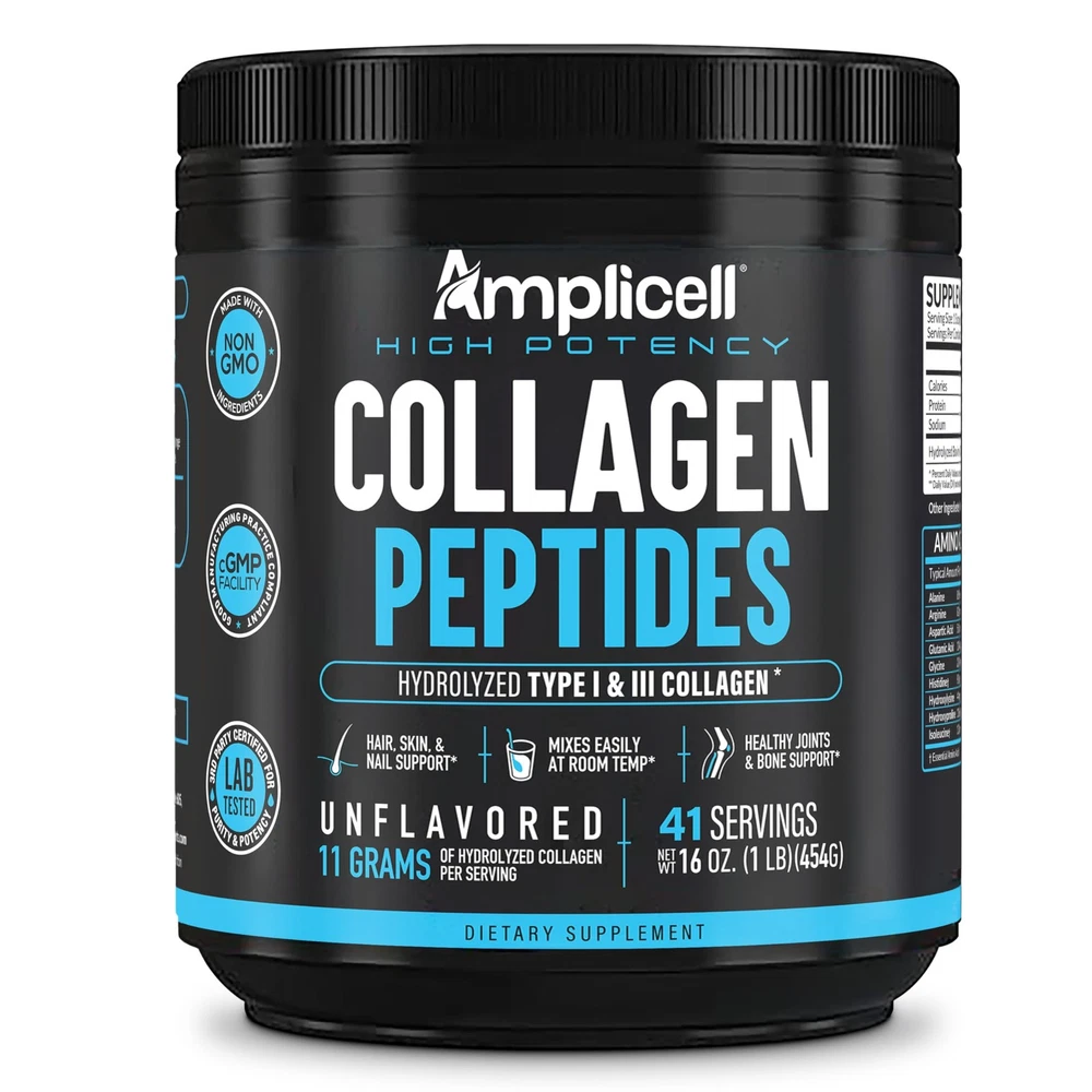 Primary Supplement Type: Hydrolyzed Bovine Collagen Serving Recommendation: 7 Grams Total Servings Per Container: 41.0 gtin13: 0880402182357 Material Feature: Gmo Free Material Type Free: Caffeine Free Dosage Form: Powder Customer Package Type: Standard Packaging Product Expiration Type: Expiration On Package Container Type: Bottle Item Form: Powder Part Number: 10026 Allergen Information: Gluten Free ISBN: 0880402182357 Unit Count: 15.9 EAN: 0880402182357 Weight: 1.26 Pounds Special Ingredients: Amino Acid, Type 1 & Type 3 Collagen Item Package Quantity: 1 Brand: Amplicell Age Range Description: Adult Type: Does not apply Specific Uses For Product: Skin Size: 41 Servings (Pack Of 1) UPC: 880402182357 Fc Shelf Life: 975.0 Flavor: Unflavored Powder Target Gender: Unisex Diet Type: Gluten Free Package Dimensions LxWxH: 6.34x4.84x4.8 Inches Ingredients: Bovine Collagen Powder