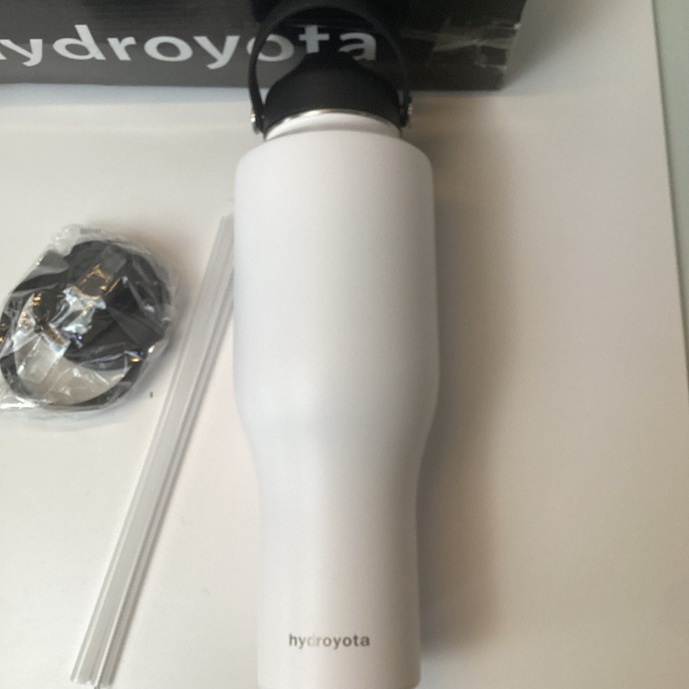 Quench your thirst in style with this Hydroyota water bottle. This sleek, white 40oz stainless steel bottle promises to keep your beverages icy cold or piping hot for hours. A durable build ensures long-lasting use, perfect for those constantly on the go. Arrives complete with an additional spout lid, straws, and a straw cleaner, offering customized hydration. Embrace eco-conscious living while staying refreshed during workouts, long commutes, or sunny beach days. Type: Water Bottle Theme: Novelty Department: Adults Material: Stainless Steel Glassware Type: Drinking Glass Beverage Type: Hot or Cold Capacity: 400 ml Keywords: Hydroyota, Water Bottle, Stainless Steel, 40 oz, Insulated, Spout Lid, Straw, Reusable, Travel Mug, Gym, Outdoor, White, Eco Friendly, BPA Free, Hydration