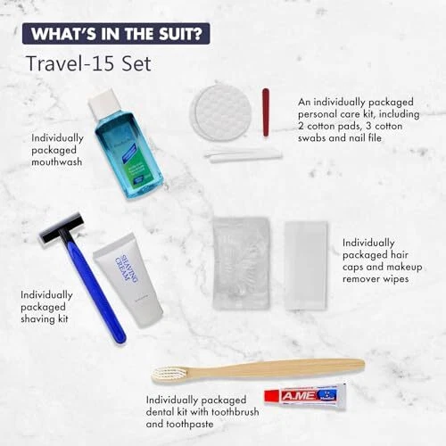 Personal Care Travel Size Toiletries Kit! 15 Sets: Travel Shaving Set, Toothbrush & Paste, Mouthwash, Makeup Wipes, Swabs & Nail File Kit and Shower Cap. The kit making it easy to carry in your bag or purse. The toiletries are all travel-sized, which means they are perfect for use when traveling by air, train, or car. The kit is also a great option for charity events, schools, and offices. The toiletries are individually packed, which means they are easy to distribute and use. The kit is fully equipped and clean and hygienic, making it a safe and reliable option for use. The travel hygiene kit is convenient kits suitable for hotel, home, camping, travel, and more. Travel-sized toiletries are perfect for travel, camping, business trips, gym, swimming, beach, hiking, etc. It is convenient to put in a backpack or travel bag It contains all the necessary items for personal care, includes 15 of each: Travel shaving set, toothbrush & paste, mouthwash, makeup wipes, swabs & nail file kit and shower cap. It is suitable for men and women The product is made of high-quality materials, safe and non-toxic, and can be used with confidence. The product is easy to carry and use, and can meet your daily needs TSA AIRLINE APPROVED: The product is individually packaged, easy to carry and use, and convenient to store. Pack everything you need for your upcoming vacation in your carry-on luggage The toiletries are all high quality and come from trusted brands. It is also a great choice for charity donations, as it provides essential personal care items to those in need
