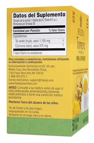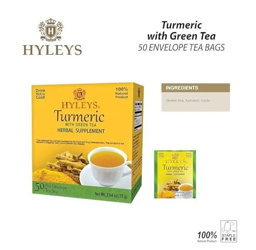 Experience the Vibrant Blend of Hyleys Turmeric & Green Tea Unlock the natural goodness with Hyleys Turmeric & Green Tea, a perfect combination crafted for those who appreciate the essence of natural herbs. This tea blend marries the earthy depth of turmeric with the refreshing vigor of green tea, creating a delightful beverage that's both flavorful and invigorating. Why Choose Hyleys Turmeric & Green Tea? Rich in Natural Antioxidants: Each sip offers the combined antioxidant properties of turmeric and green tea, known for supporting vitality. Soothing and Refreshing: Perfect for any time of the day, this tea blend provides a soothing yet refreshing drink that can be enjoyed both hot and iced. Quality and Simplicity: Made from 100% natural ingredients, this tea is free from artificial additives, aligning with a health-conscious lifestyle. Easy to Prepare: Each tea bag is individually wrapped to preserve freshness and ensure that every cup is as flavorful as the last. Enhance your daily tea routine with Hyleys Turmeric & Green Tea. Whether starting your day with an energizing cup or winding down in the evening, this tea is a perfect choice for anyone seeking to enjoy the natural benefits of these two powerful herbs in one delightful cup. Make Hyleys Turmeric & Green Tea a part of your daily routine and savor the taste of natural wellness in every cup. Natural Antioxidant Blend: Combines the powerful natural antioxidants of green tea and turmeric for a revitalizing tea experience. Rich Flavor Profile: Enjoy the robust flavors of green tea paired with the earthy notes of turmeric in every cup. Versatile Tea Experience: Ideal for both morning energizing and evening relaxation. Pure Ingredients: Made with all-natural ingredients, ensuring a clean and wholesome tea experience. Conveniently Packaged: Each box contains 50 individually wrapped tea bags, perfect for maintaining freshness and flavor.