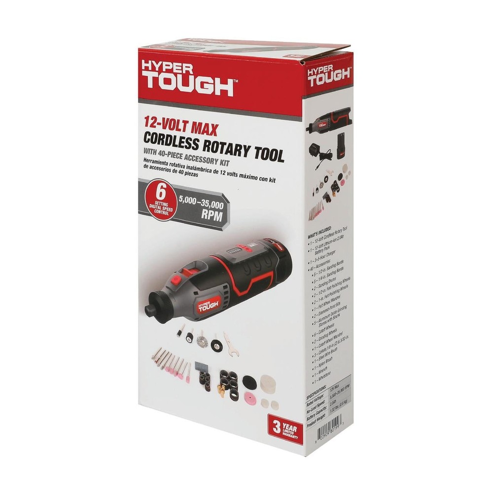 The new Hyper Tough 12V Max Cordless Rotary Tool is perfect for detailed work, offering versatility with its 40-piece accessory kit. Powered by a 12V 2.0Ah lithium-ion battery, it delivers variable speeds from 5,000 to 35,000 RPM with a max setting for more demanding tasks. The tool features a battery capacity indicator and LED speed controls, allowing easy adjustments via Add & Subtract buttons. Weighing just 1.32 lbs, it’s lightweight and comfortable to use for extended periods. The kit also includes a charger, making it ideal for any project requiring precision and control. Hyper Tough 12V Max Cordless Rotary Tool with 40-Piece Accessory Kit Includes 12V 2.0Ah Lithium-Ion Battery and Charger Variable speeds (6 + MAX setting) Battery capacity indicator LED indicator for variable speed via Add & Subtract button 1.32 lbs product weight No-Load speed 5,000-35,000 RPM New
