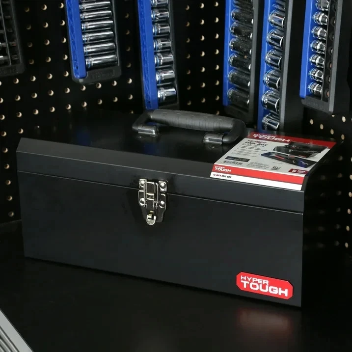 Product details This Hyper Tough 16-Inch Black Metal Toolbox with Removable Tray (model 3482V) allows for convenient storage and portability of your tools. The tool box has many high quality features like a lockable metal latch and removable metal tray. The unit is made from heavy gauge steel with a hinge that runs the full length of the box and is finished with powder coat paint for long lasting use and durability. This tool box provides convenient storage and organization of your most commonly used tools. Hyper Tough 16-Inch Metal Tool Box with Removable Tool Tray, Black 16-inch Metal Tool Box: Allows for convenient storage and portability of tools Metal Latch: Firm latch will securely hold all your tools Removable metal tray: Allows for easy organization Full length hinge Powder coated paint: Long lasting and durable Constructed of long lasting, durable materials Color: Black