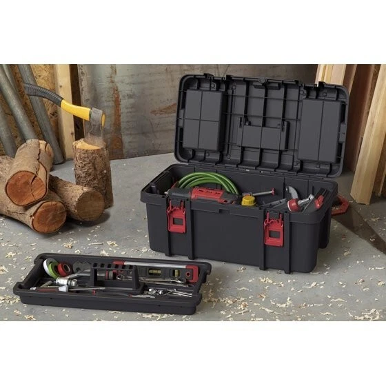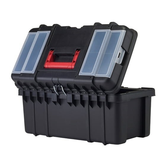 The Hyper Tough 22-Inch Toolbox was designed with the ambitious DIYer in mind but this heavy-duty tool box comes with plenty of pro functionality. The integrated lid organizers boast clear lids so you can see the contents in an instant. A removable utility tray allows for easier hand tool transportation so you can keep your more frequently used tools within reach. Easy to haul around from the garage to the back yard, the tool box comes with a central carrying handle. A metal lid stopper guarantees that the lid stays open for as long as you want it to, without collapsing as you search for components inside the box. The pad lock ready eye offers a convenient security upgrade method to keep your tools secure. Portable tool box 2 integrated lid organizers with clear lids Removable utility tray Carrying handle Metal lid stopper Pad lock ready (lock not included) Heavy-duty construction
