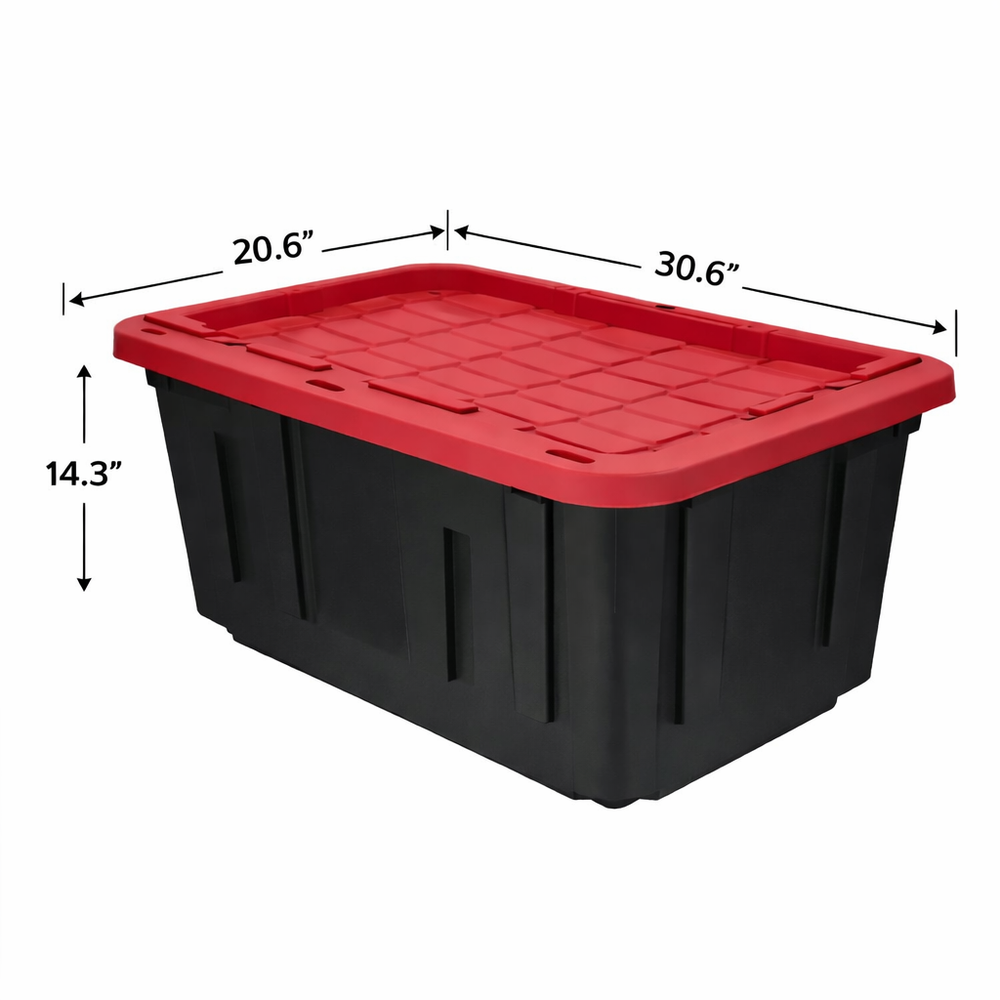 Product Description Organize clutter and protect your belongings with the Hyper Tough 27 Gallon Snap-Lid Plastic Storage Tote . Designed with a durable black base and a high-visibility red lid , this heavy-duty storage bin keeps items neatly hidden while making identification quick and easy. Constructed from tough polypropylene plastic , this storage tote resists rust, dents, stains, and peeling for long-lasting use. The 2-point snap-fit lid keeps contents securely in place during storage or transport. Specially molded lids allow multiple totes to stack safely without toppling , helping you maximize vertical storage space. For added security, the lid features 6 tie-down holes , making it easy to secure items using zip-ties or padlocks (not included). Ideal for use in basements, closets, garages, sheds, barns, attics, or pantries, this versatile storage tote is perfect for organizing everything from household supplies to seasonal gear. Key Features Large 27 Gallon Capacity – Ideal for bulky and heavy storage needs Durable Polypropylene Plastic – Resists rust, dents, stains, and peeling Secure Snap-On Lid – 2-point snap-fit design keeps contents contained Stackable Lid Design – Molded lid provides stability when stacking multiple totes Lockable Lid – 6 tie-down holes for zip-ties or padlocks Easy-to-Clean Surface – Wipes clean with minimal effort Indoor & Outdoor Use – Suitable for home, garage, shed, or attic Reusable & Long-Lasting – Built for repeated everyday use Made from Recycled Materials – Eco-conscious construction Specifications Product Type: Plastic Storage Tote / Storage Bin Brand: Hyper Tough Capacity: 27 Gallons Material: Polypropylene Plastic Color: Black Base with Red Lid Shape: Rectangle Stackable: Yes Lockable: Yes (zip-ties or padlocks not included) Recommended Location: Indoor / Outdoor Exterior Dimensions (W × D × H): 30.6 x 20.6 x 14.3 inches (77.7 x 52.3 x 36.3 cm) Weight: 6.6 lbs Recommended Uses Household storage and organization Garage, basement, attic, shed, or barn storage Clothing, shoes, and seasonal gear (boots, coats) Gardening tools and supplies Pet food, treats, and accessories Sports equipment (golf balls, tennis balls, cones) Pantry or closet organization 📦 Package Includes 4 × 27 Gallon Plastic Storage Tote (Black Base) 4 × Red Snap-On Lid