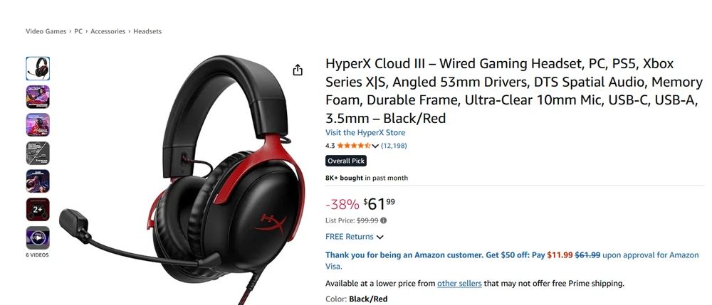 Features: Noise Cancellation Model: HyperX Cloud III Type: Ear-Cup (Over the Ear) Microphone Type: Boom Number of Earpieces: Double gtin13: 0197029008237 Color: Red, Black UPC: 0197029008237 Connectivity: 3.5mm Jack, USB-C MPN: 727A9AA Form Factor: Headband Brand: HyperX
