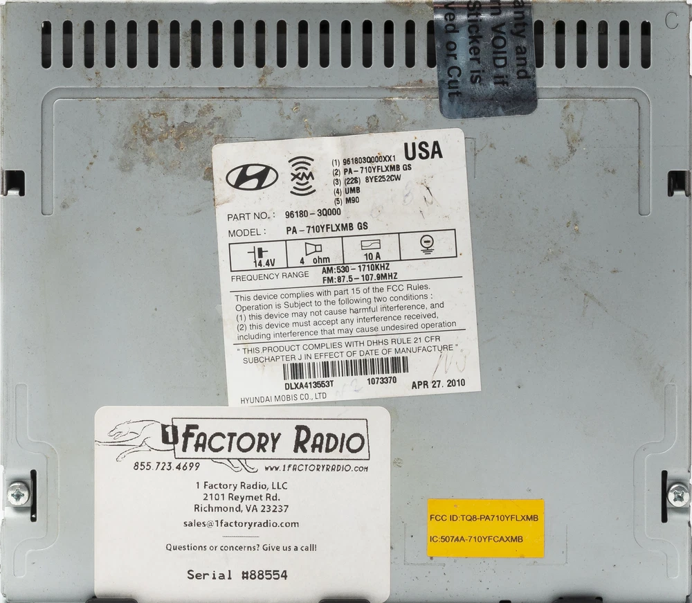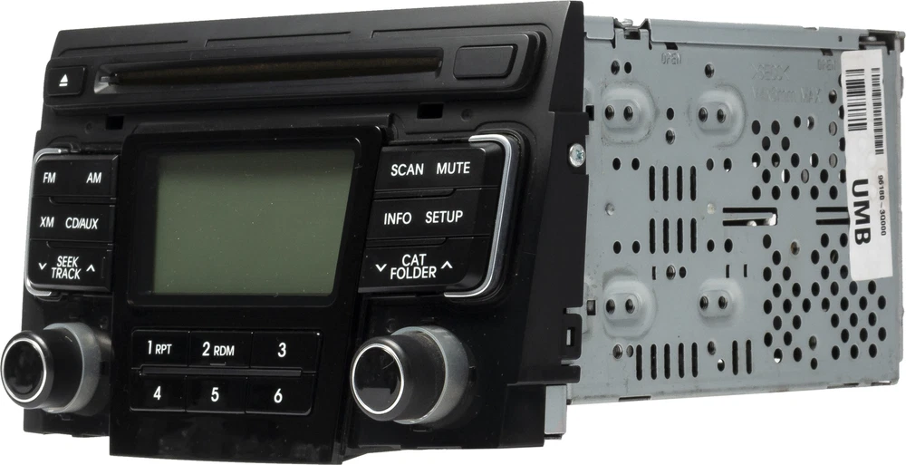 Warranty: 90 Day Fitment Type: Direct Replacement Dealer Unlock Required: No Features: AM FM Receiver with Single Disc CD Player Placement on Vehicle: Front Brand: Hyundai Code Included: No Code Required gtin13: 00842582170883 Heat Controls Included: No UPC: 00842582170883 Factory OEM: Yes Manufacturer Part Number: 96180-3Q000 Blemish: Minor wear Surface Finish: Black Interchange Part Number: 638-52168 Years: 2011