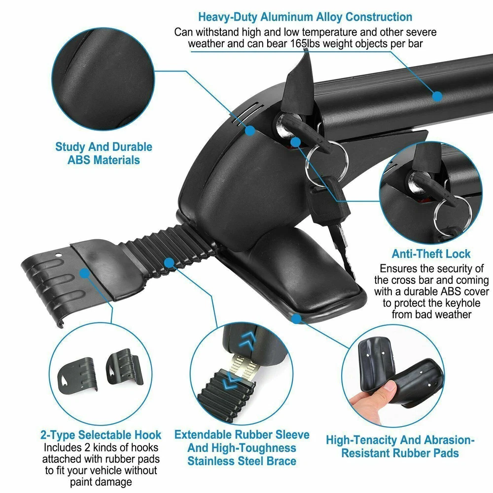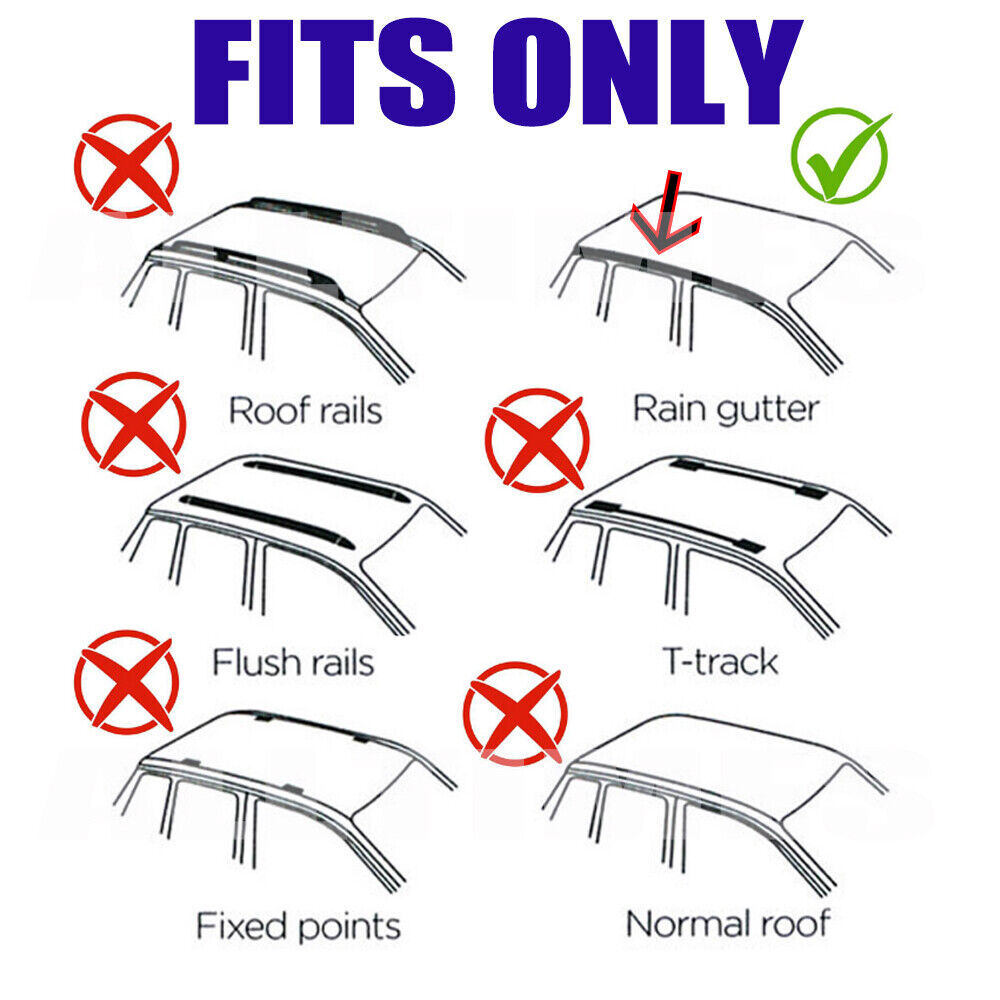 Product Description NOTE: This won't screw into the existing roof rail holes, it's just secured by pulling the side of the frame!! Please Notice: This item won't fit the vehicles with panoramic sunroof. Not for cars with frameless glass Please check our item size before paying to avoid choosing WRONG SIZE item for your car !! Item model and Compatibility Table are just a reference, take size as a standard. Features : Brand new and Professional grade quality. Rubber strip included for extra grip. Elliptical shape to minimize wind resistance. Ratchet Tensioners Allow Easy Adjustment. Always Ensure Bars Are Securely Fitted Before Driving. Designed for Cars that Do Not Have Raised Roof Rails Already Fitted. Lockable Anti-Theft Design - 2 Locks Per Bar (includes keys). Note: If you need installation instructions please contact us and we will give you help! Suitable for 4 or 5 Door Cars Only (not suitable for 2door,3 door cars, vans or large 4x4s). Metal Brackets Clamp Under Door Recess - Includes 2 Clamp Types. T-slot channel allows easy installation with enhanced strength and low air resistance. Specifications: Color : Black Roof Bars Size : Details show in the picture Bar Length : 43.3 inch /110cm Material: Aluminum Vehicle with rain gutters: apply to 43.3-45"(110-115cm) distance between rain grooveers Quantity : Supplied in Pairs Max Load : 75kgs (load must be uniformly distributed across the bars) Package Included: 2 x Car Roof Bars 2 X keys Payment Shipping Return Contact US Feedback We accept PayPal, MasterCard, Visa, Google Pay, Apple Pay, American Express, Credit Card, Debit Card, Gift Card. If you can not pay in time, please contact us. 1. Orders processed within 24hours of payment verification. 2. We only ship to confirmed Paypal addresses. Your PAYPAL address must match your Shipping address. 3. Service transit time is provided by the carrier. Transit times may be a little delayed during holiday season. 4. We will track the shipment and get back to you as soon as possible with a reply. Our goal is customer satisfaction! 1. Accept Return in 30days for refund or replacement, goods in resalable condition 2. Offer 90 DAYS for repair warranty 3. message for address and reference number before return(note: unannounced parcel may be returned to wrong address, seller will not be responsible for this. 1.We have always been doing our best to provide the best service and reliable products for every customer. 2.Please do not hesitate to contact us to resolve the issues.We will reply your emails and questions within 48 hours. ☆We're always working to improve the quality of our services,we are hoping to get your positive feedback and 5 Stars in return,so that we could do better for you in the future! ☆If you have any problem or unsatisfied with our products, please do contact us first,we will do our best to satisfy you.Your 100% satisfaction is our power to advance! Payment We accept PayPal, MasterCard, Visa, Google Pay, Apple Pay, American Express, Credit Card, Debit Card, Gift Card. If you can not pay in time, please contact us. Shipping 1. Orders processed within 24hours of payment verification. 2. We only ship to confirmed Paypal addresses. Your PAYPAL address must match your Shipping address. 3. Service transit time is provided by the carrier. Transit times may be a little delayed during holiday season. 4. We will track the shipment and get back to you as soon as possible with a reply. Our goal is customer satisfaction! Return 1. Accept Return in 30days for refund or replacement, goods in resalable condition 2. Offer 90 DAYS for repair warranty 3. message for address and reference number before return(note: unannounced parcel may be returned to wrong address, seller will not be responsible for this. Contact US 1.We have always been doing our best to provide the best service and reliable products for every customer. 2.Please do not hesitate to contact us to resolve the issues.We will reply your emails and questions within 48 hours. Feedback ☆We're always working to improve the quality of our services,we are hoping to get your positive feedback and 5 Stars in return,so that we could do better for you in the future! ☆If you have any problem or unsatisfied with our products, please do contact us first,we will do our best to satisfy you.Your 100% satisfaction is our power to advance! powered by