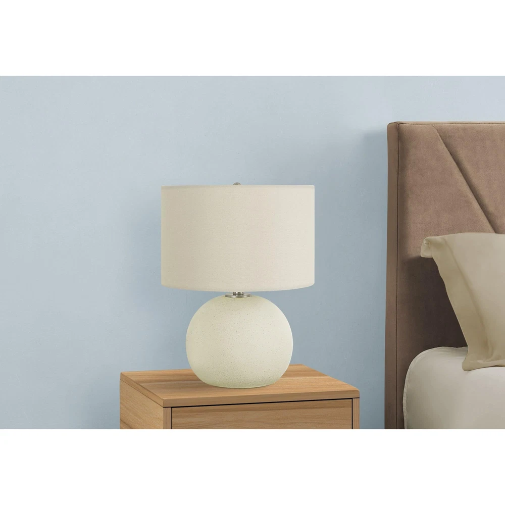 This stylish and fashionable 18"h table lamp with a textured, cream ceramic globe-shaped base and matching ivory fabric drum shade, finished with a round silver finial on top, is the perfect accent to brighten any room. Featuring a 3-way switch holding a single bulb (not included) with a maximum output of 100W/120V, allows you to customize the lighting ambiance in your living room, home office, or bedroom. With a contemporary appeal, place this versatile decorative lamp on a side or end table, on a console, or on your nightstand to create a warm and inviting atmosphere. Made with durable quality materials ensuring longevity, this lamp includes a 2 year limited against any manufacturer s defects for a worry-free purchase. Brighten up your living room, home office, or bedroom with this chic globe shaped 18"h table lamp, with a textured cream ceramic base and topped with an ivory fabric drum shade for a contemporary appeal. The easy to use 3-way rotary switch holds a single bulb (not included) with a maximum output of 100W/120V to adjust the lighting ambiance and instantly illuminate or dim a room. Attached with a 6ft transparent cord, place this versatile accent lamp on any end or side table, console, nightstand or bedside table for a practical lighting source. Minor assembly is required with illustrated instructions included; made with durable materials and backed with 2-year limited against manufacturer s defects for your satisfaction. Assembled dimensions: 14 in. L x 14 in. W x 18.25 in. H; base: 10 in. L x 10 in. W x 8 in. H; shade: 14 in. L x 14 in. H x 9 in. H