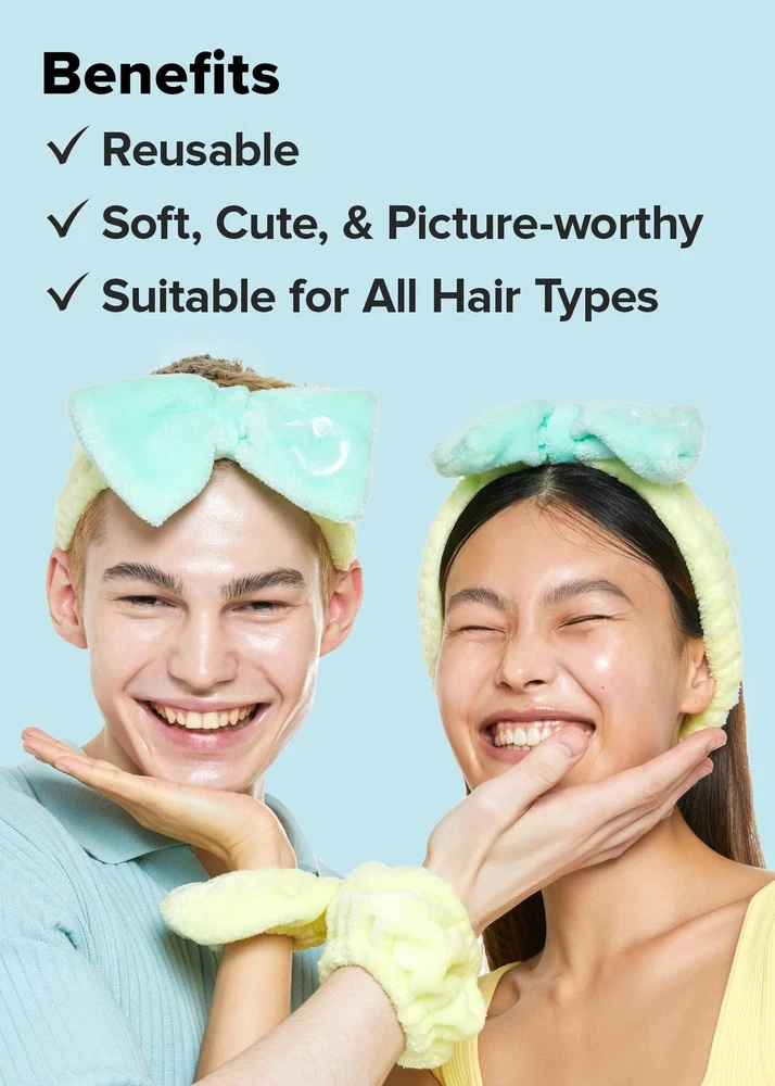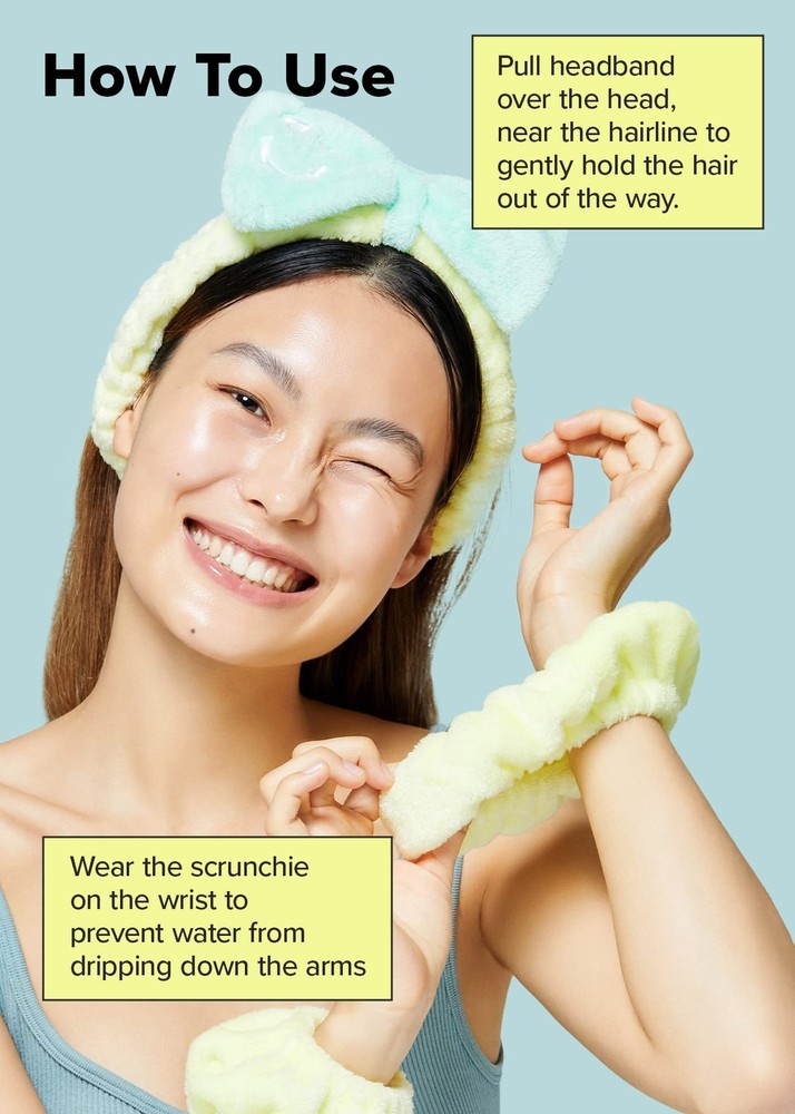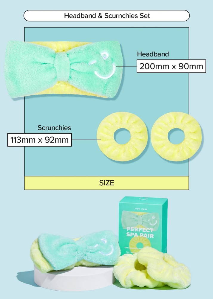 I DEW CARE Face Wash Headband & Scrunchie Set - Perfect Spa Pair | Adorable Design, Washing & Cleansing, Makeup and Spa, Quick Dry, Soft & Fuzzy, Non Slip, Teen Girls Stuff, Mother's Day Keep flyaways and hair out of the way while washing your face or putting on makeup with this super soft, super cute, super picture-worthy headband and scrunchies. Features WHO IS I DEW CARE: Seriously Fun Skincare. We make fun formulas that seriously work. Smile-inducing K-beauty for her, him, they, and everyone. PERFECT SPA PAIR: Keep flyaways and hair out of the way while washing your face or putting on makeup with this super soft, super cute, super picture-worthy headband and scrunchies. VERSATILE: Perfect for everything from washing face to putting on makeup or just however you want! REUSABLE: Wear it over and over! Just make sure to handwash and let it out to dry if needed. TOTALLY GIFTABLE: This cute spa pair makes a great gift for a sibling, a friend, a spouse or a child. WHO IS IT FOR: Suitable for everyone of all ages for a self-pampering session. HOW TO USE: Pull over the head, near the hairline to gently hold the hair out of the way. Wear the scrunchie on the wrists to prevent water from dripping down the arms. RECOMMENDED TO USE WITH: Pair it with I DEW CARE's Mini Meow Trio magic chrome peel off mask, Mini Scoop/Mighty Mask/Yoga Kitten wash-off mask for an awesome self pampering session. SUSTAINABLY PACKED: This product is packed with love in FSC certified packaging and is made of high quality microfiber material. Details Fast and Free Shipping You're already purchasing the item. Why pay additional for shipping, especially slow shipping? We get your order shipped out within 1-business day and delivered to your doorstep as quickly as possible. Competitive Pricing With our dynamic pricing model, our prices are always competitive. Our prices are some of the lowest that you will find on the internet. Rest assured that you're getting a good deal when purchasing with us. 30-day Money Back Guarantee We are committed to making sure that you leave this transaction satisfied. If you're unhappy with the product for any reason, you may return it back for your money-back or a replacement within 30 days. No questions asked!