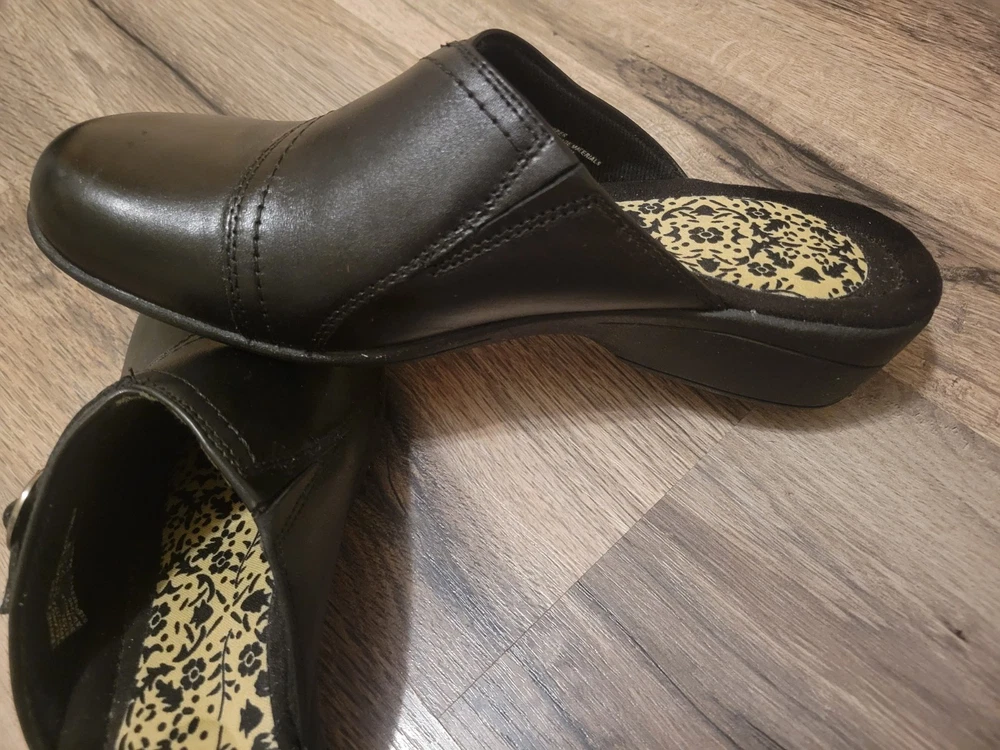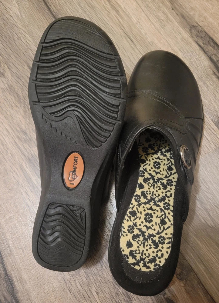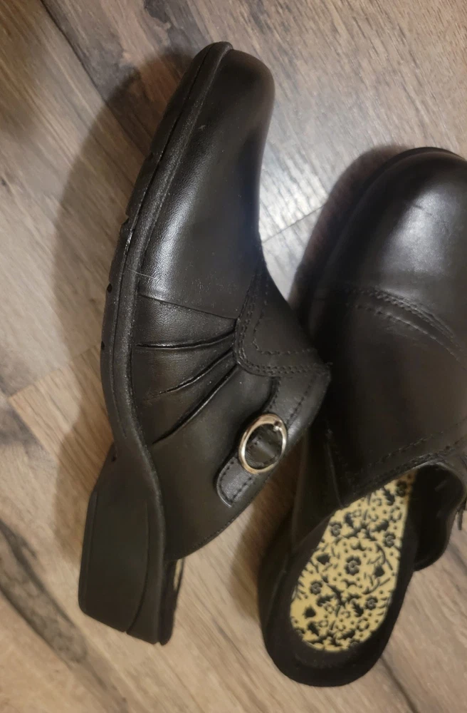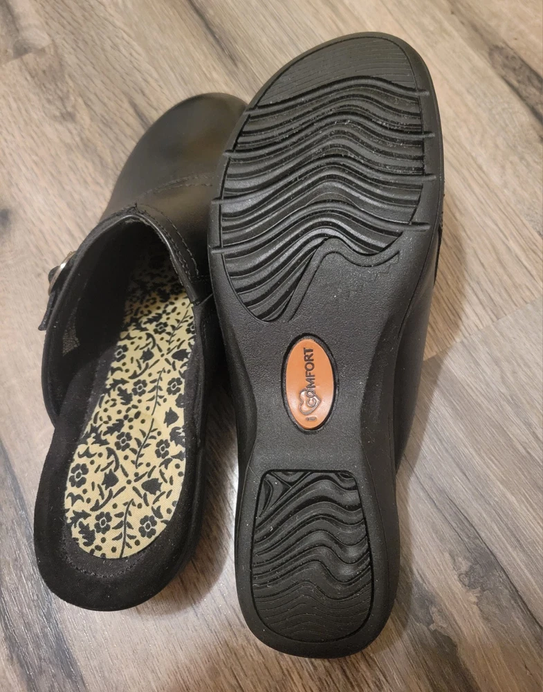 These are black leather clogs by I Love Comfort in size 9.5 for women. They feature a round toe, slip-on closure, mid heel height, and a wedge heel style. The clogs have a buckle accent and a synthetic outsole, providing comfort for walking. Perfect for casual or workwear occasions during winter, summer, fall, or spring. The shoes have a classic, preppy style and are suitable for teachers or school settings. Scuff mark on top of the shoe, please see pictures.