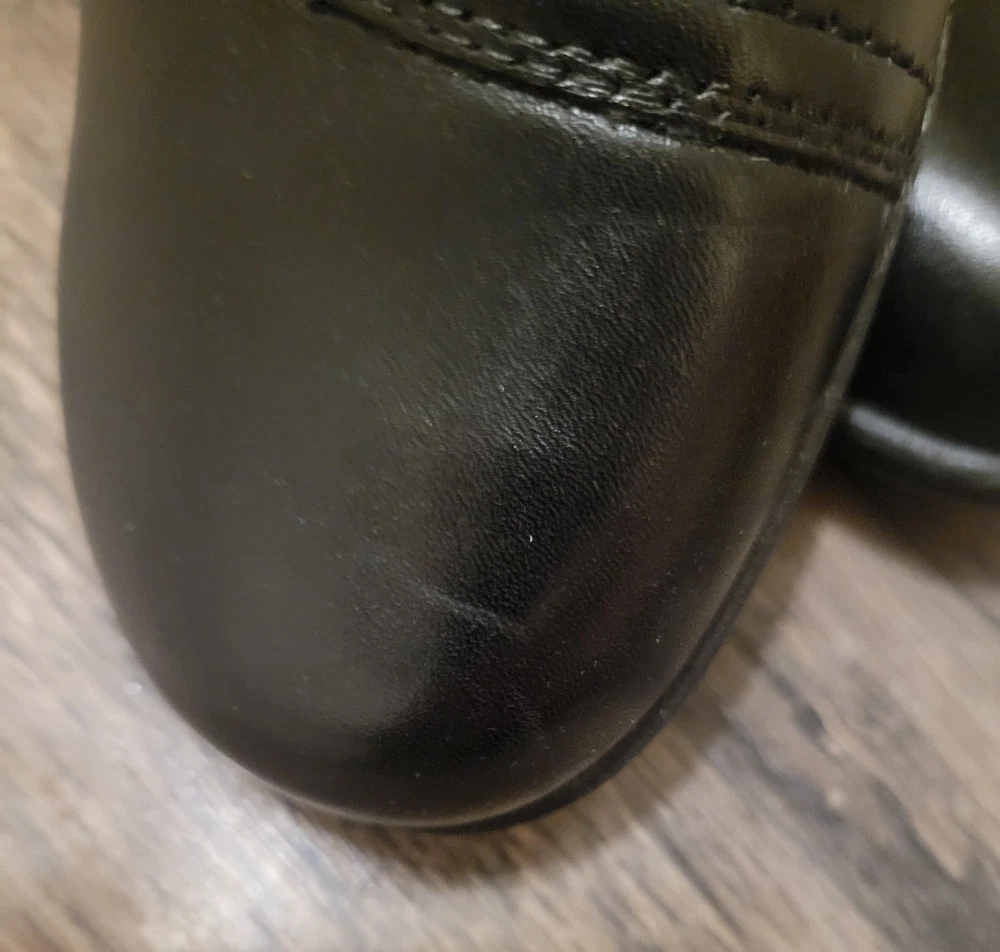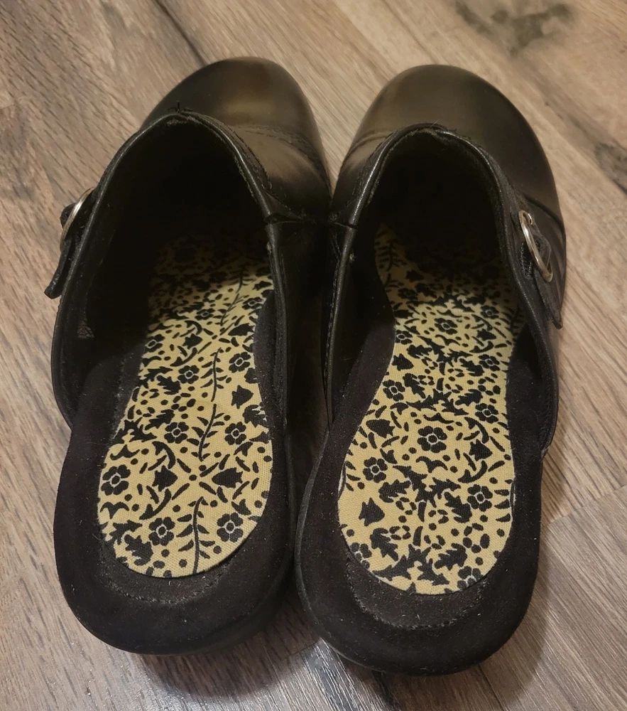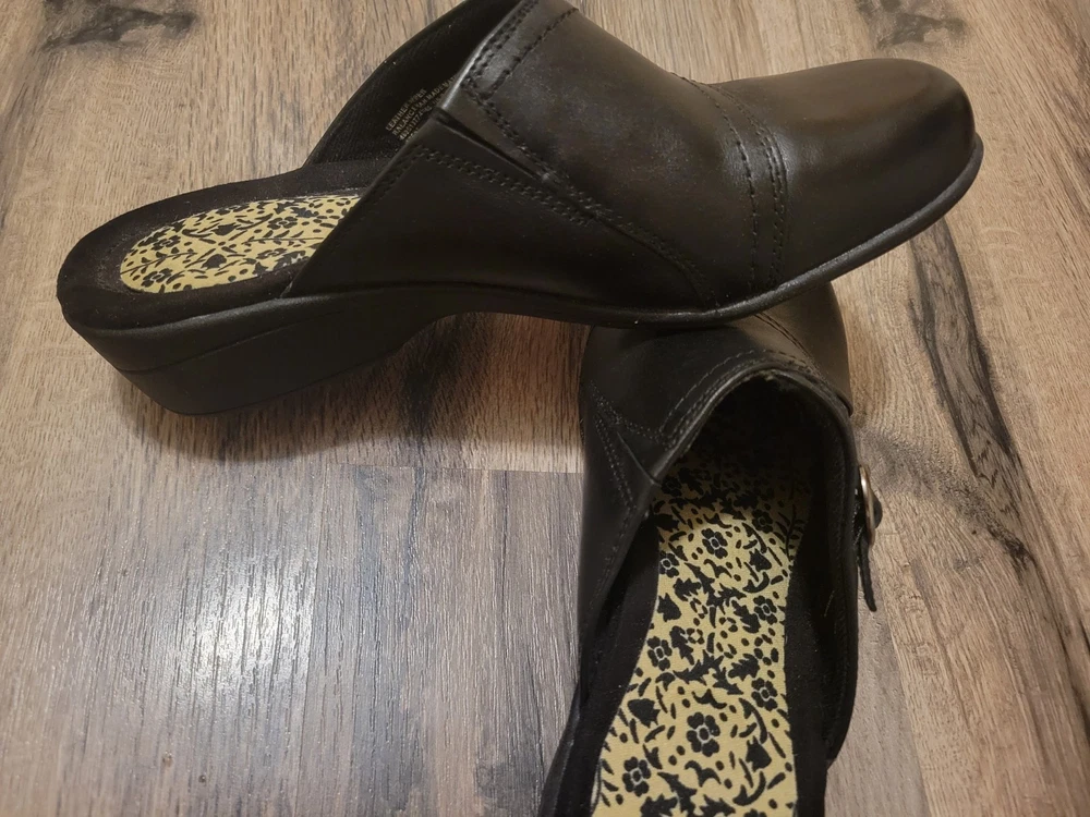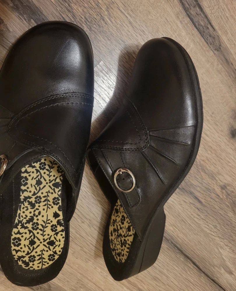 These are black leather clogs by I Love Comfort in size 9.5 for women. They feature a round toe, slip-on closure, mid heel height, and a wedge heel style. The clogs have a buckle accent and a synthetic outsole, providing comfort for walking. Perfect for casual or workwear occasions during winter, summer, fall, or spring. The shoes have a classic, preppy style and are suitable for teachers or school settings. Scuff mark on top of the shoe, please see pictures.