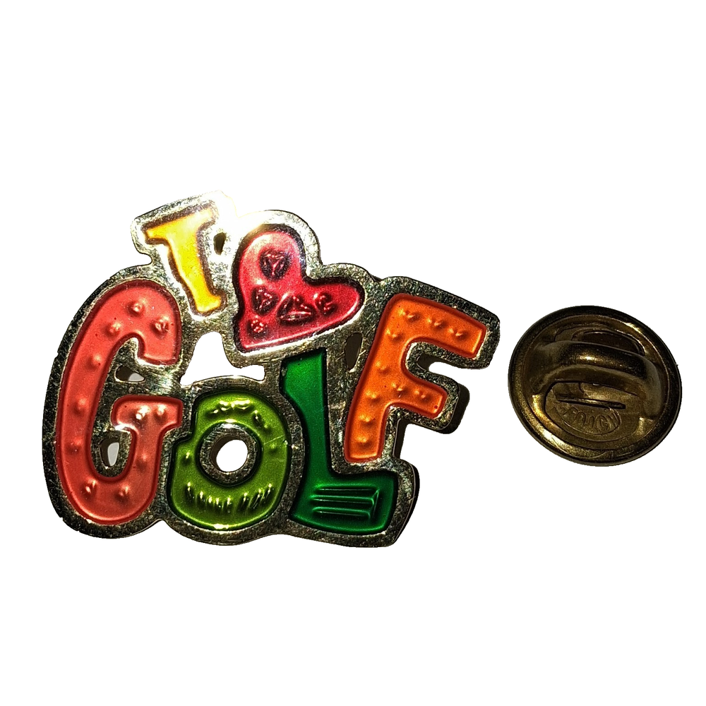 This silver tone enamel hat lapel pin features a design that is perfect for golf enthusiasts. The pin showcases a cute and playful I Love Golf design, making it a great accessory for collectors or fans of the sport.