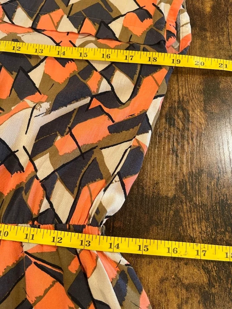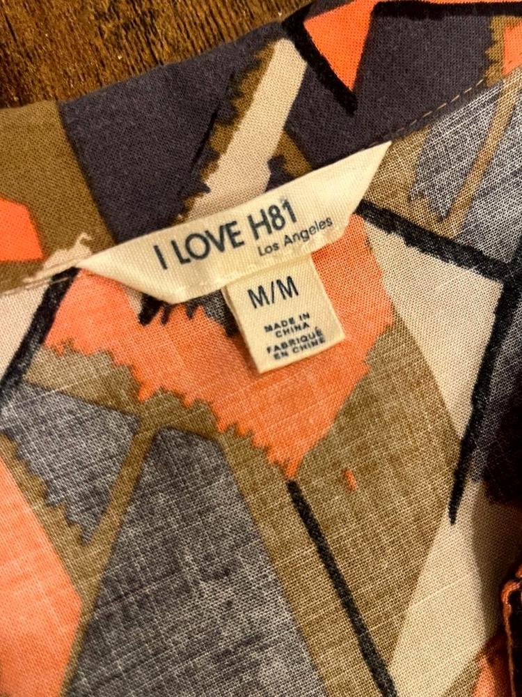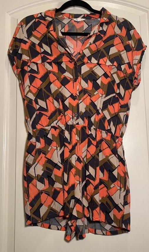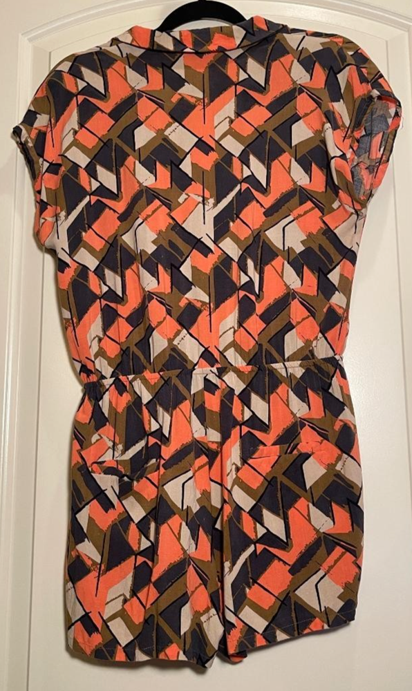 The I Love H81 Women's Multicolored Collared Short Sleeve Romper in size M is a stylish and casual one-piece outfit perfect for everyday wear. Made from comfortable rayon material, this romper features a geometric pattern, collared neckline, and buttons on the top half for added detail. With an elastic waist and pockets for added functionality, this romper offers a regular fit and is the perfect addition to any woman's wardrobe.