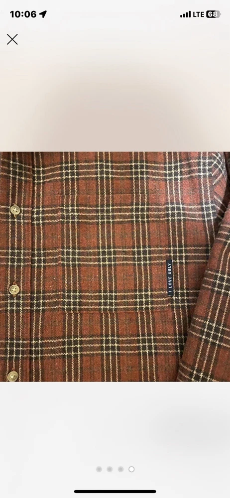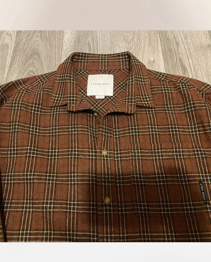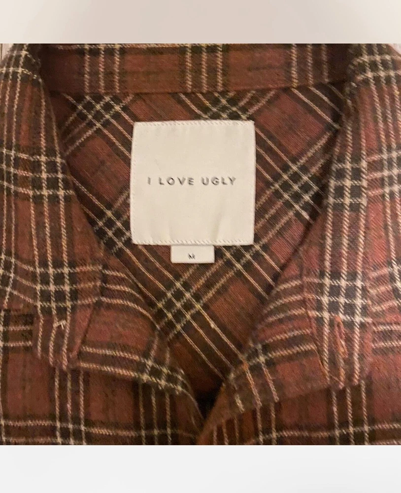 I Love Ugly Flannel Button Up Plaid Checkered Wool Shirt or Overshirt Medium Quality is amazing, more on the heavyweight side, perfect for the fall or winter. The length has been professionally cropped, check measurements below. Brand for exposure. pit to pit 19 shoulder 18 collar to hem 25 1/2