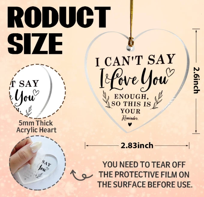 Free eBay listing template designed by dewiso.com I Love You Acrylic Sign, Valentines Day Gift for Him Her, Boyfriend Gift, Girlfriend Gift, Romantic Anniversary Sign for Husband Wife, Acrylic Sign Gift, Heart Shaped Acrylic Sign, Miss You Gifts FREE AND FAST SHIPPING! 【Size】: The product is 66 cm long and 72cm wide. The Thickness is 5 mm. Light and portable, firm and compact, not easy to break or deform. 【Exquisite Design】:The beautifully printed patterns and expressions of love and gratitude make this acrylic plaque an exquisite decorative piece. Its eye-catching design adds a touch of elegance to any environment, making it a standout commemorative item. 【Premium Quality】: The heart-shaped sign is made of high-quality acrylic material, with smooth surface, comfortable touch, no terrible smell, no burr, solid and reliable, and can accompany you for a long time. 【Meaningful gift】: Our product is packaged in a gift box. The sentence on its surface, tenderly express your love to your loved ones on most occasions, and can make them smile. So our acrylic sign is ideal to be sent to your family or friends directly on important occasions and holidays, such as birthdays, anniversary, Christmas, or other special moment. 【Easy to Hang】: The hanging heart-shaped plaque is equipped with a rope design, which makes it easy to hang anywhere you want to decorate. This sign will be the perfect addition to your home, office and your car. Product We offer a 30-Day Return Policy on items which you are not completely satisfied with. You have the option for a full-refund or an exchange of the item. No returns are available on items shipped outside of the US . Shipping We offer Free Shipping to the US and ship within 2 business days of payment, usually sooner. We use UPS express shipping. That's why your products are usually delivered within 3 days . Contact We try our very best to make sure every customer is completely satisfied. If there's a problem , message us! We're happy to help. 24/7 live chat available.