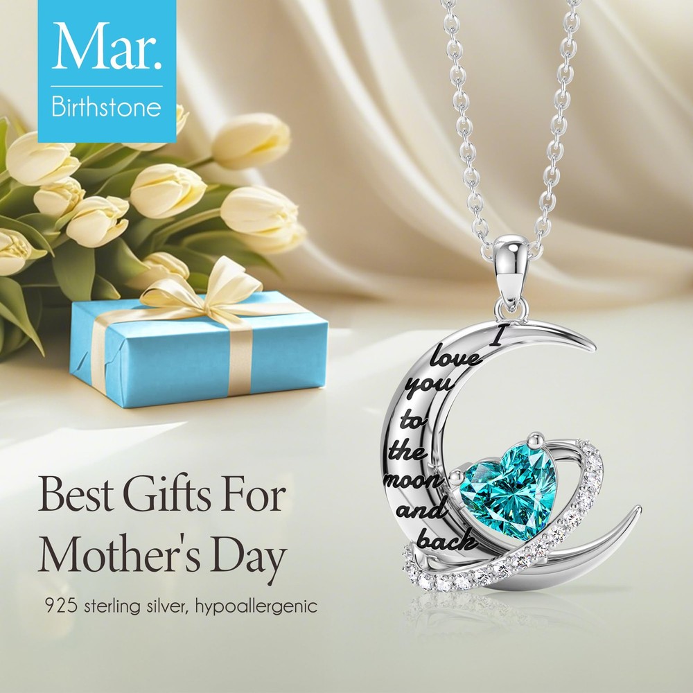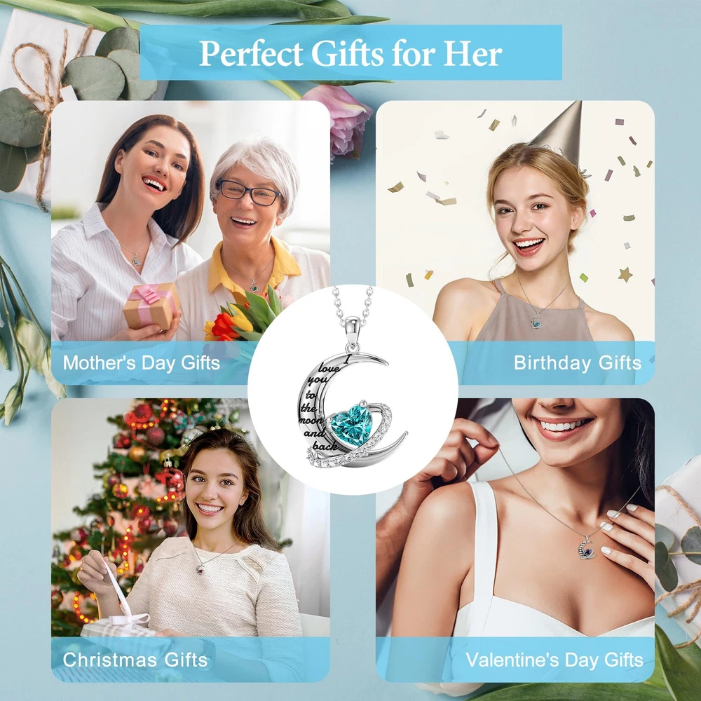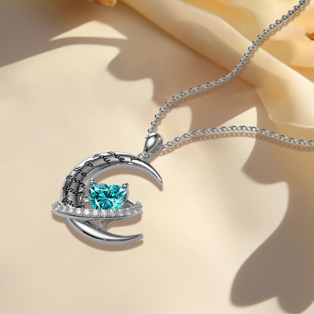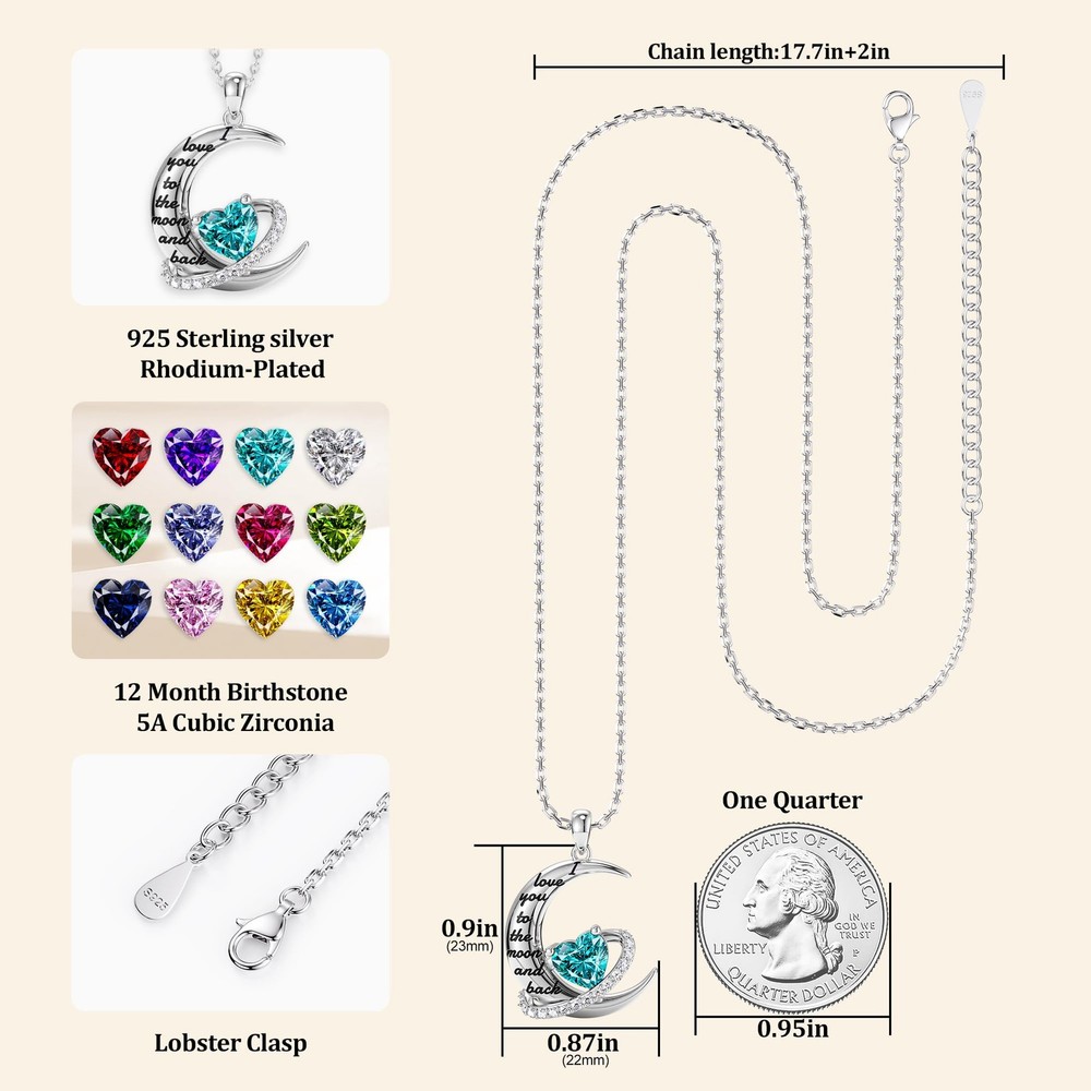 πMarch-Aquamarine Blue Heart Birthstone: Crafted using 5A grade heart-shaped cubic zirconia as the birthstone, 5A grade gemstones have more facets than 3A, making the gemstone appear even more radiant and brilliant when refracting light. They possess a higher level of clarity and are often used as diamond substitutes in mid-range jewelry. Additionally, they are expertly set by professional jewelers to prevent any surface abrasion on the cubic zirconia gemstone. π"I Love You" β The heart-shaped birthstone orbits the moon like a planet, while the moon itself bears the inscription "I love you to the moon and back." This romantic expression signifies deep affection and serves as a constant reminder to the wearer that you are deserving of a lifetime of love. πππ°ππ₯π«π² ππ©πππ’ππ’ππππ’π¨π§π¬: The moon necklace is crafted from 925 sterling silver with a white gold plating, nickel-free, lead-free, and hypoallergenic. chain length: 17.7in + extension chain 2in (45+5cm), weight: 6.67g. Pendant: 0.87*0.9in (22*23mm). πCommemorative Gift: The birthstone moon pendant necklace comes beautifully packaged in a jewelry gift box and includes a silver polishing cloth. It's available in twelve different colors, each corresponding to a different month, allowing you to choose the birthstone color or your preferred shade. Perfect for gifting to daughters, female friends, girlfriends, wives, and mothers on occasions such as Valentine's Day, anniversaries, birthdays, and Christmas, or for any special women in your life. β₯ πππ«ππππ πππ«π―π’ππ β₯Our company is dedicated to delivering high-quality jewelry and the best customer service. If you are not satisfied, please feel free to contact us and we will do our utmost to assist you. Search for "the store" on Amazon to explore more of our designs!