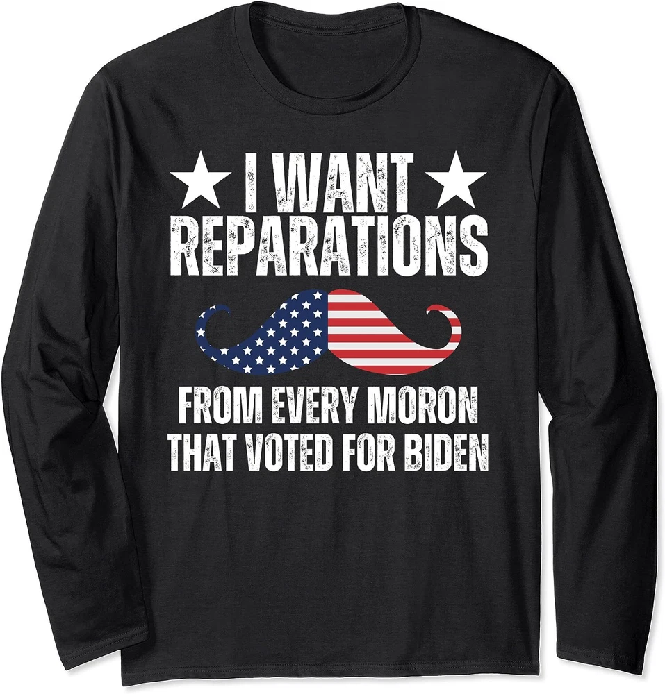 Welcome to Our eBay Shop Fast Shipping Hasslefree Returns Secure Payment Excellent Service I Want Reparations Funny Biden Quotes Gift Product Description All of our t-shirts are brand new and made to order. They are printed in our New York facilities with love and passion. We use various printing methods to ensure you the high quality, long lasting garments you or your loved ones deserve. We carry sizes from Youth Small to Adult-5XL in long sleeve t-shirts (depending on the design). You can refer to "SPECS & SIZING" to get accurate information regarding the sizes of the garments we use. This design is also available and printed on different types of garments in our store.If you would like this graphic printed on a different type of garment than a long sleeve t-shirt, please make sure to check our store ! If you have any questions regarding this item or any other item we have for sale, do not hesitate to contact us. We answer all messages within 1 business day. SPECS & SIZING SHIRT CARE TIPS Wash inside out with cold water with similar colors using a gentle cycle. Tumble dry low or hang-dry Avoid using bleach and do not dry clean. PAYMENT We accept payment by any of the following methods: PayPal Please pay as soon as possible after winning an auction, as that will allow us to post your item to you sooner! SHIPPING Your order will be dispatched within 2 business days of receiving payment (Monday-Friday) with a tracking number. In the very unlikely event that your item is lost or damaged during post, then WE are responsible and will issue either a full refund or replacement. RETURNS If you are not 100% satisfied with your purchase, you can return the product and get a full refund or exchange the product for another one, be it similar or not. You can return a product for up to 14 days from the date you purchased it. Any product you return must be in the same condition you received it and in the original packaging. Please keep the receipt. Feedback * Your great positive feedback will be greatly welcomed! * If you have any problem when you receive the item, please contact us first, we'll do our best to resolve the problem!:) Copyright © 2022 | All Rights Reserved