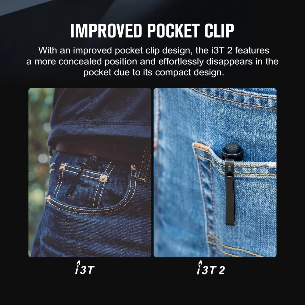 [Amazingly Bright for Its Size] Powered by a single AAA battery, I3T 2 delivers an output of up to 200 lumens, offering both constant and momentary-on options for various tasks and environments. The flashlight can be initially powered on in your preferred low or high mode depending on your needs [Flexible Battery Options] In addition to an AAA alkaline battery, I3T 2 is also compatible with a rechargeable battery, which can boost the maximum output to 300 lumens [Extended Runtime With Lower Temps] I3T 2 features an extended battery life, increased by 31%, and maintains a surface temperature of less than 45°C even during prolonged use [Enhanced Pocket Clip] With the new pocket clip, the flashlight allows for deeper pocket carry and effortlessly goes unnoticed due to its compact design [Hands-free Use] Simply clip it onto a hat brim and you can use it as a convenient headlamp Product Description A Flashlight Accompanies You Like a Friend, to Help You Indeed, to Guide Your Road and to Side by You 1 Two Modes 2 Excellent Lumens 3 Improved Clip 4 Compact Design 5 Perfect Gift 1 Compairson 2 Specification Technical Details Light Source Cool White LED (5700-6700K) Max Output 200 lumens (300 lumens if using a rechargeable battery) MAX Throw 207 ft/62 m Length 3.5 in/89 mm Head Diameter 0.59 in/15 mm Body Diameter 0.59 in/15 mm Weight 1.47 oz/41.8 g Body Material Aluminum Alloy Waterproof IPX8 Package Content i3T 2 EOS x 1; 1.5V Alkaline AAA battery x 1; O-ring x 2 User Manual x1 Featured Product from OLIGHT Add to Cart Add to Cart Add to Cart Add to Cart Add to Cart Add to Cart Add to Cart Customer Reviews 4.6 out of 5 stars 602 4.6 out of 5 stars 14,591 4.7 out of 5 stars 2,222 4.7 out of 5 stars 2,179 4.7 out of 5 stars 1,893 4.4 out of 5 stars 207 4.7 out of 5 stars 389 Price $15.99 $ 15 . 99 $17.99 $ 17 . 99 $28.76 $ 28 . 76 $17.56 $ 17 . 56 $15.99 $ 15 . 99 $19.79 $ 19 . 79 $43.99 $ 43 . 99 Max Output 200 lumens 180 lumens 350 lumens 180 lumens 50 lumens 700 lumens 1,300 lumens Max Throw 207 ft/63 m 197 ft/60 m 213 ft/65 m 157 ft/48 m 69 ft/21 m 262 ft/80 m 558 ft/170 m Operate Mode Tail Switch Tail Switch Tail Switch Twist Pop it off the magnetic cap Side Switch Side Switch Rechargeable × x ✓ ✓ ✓ ✓ ✓ Water-proof Level IPX8 IPX8 IPX8 IPX8 IPX6 IPX8 IPX8