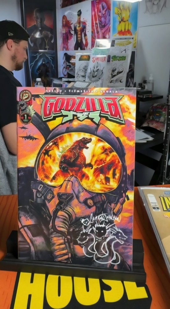 The product is a limited edition trade signed and remarkedd with a cool hydra in white and rare long signature, by Camron Johnson of IDW Godzilla #1. This variant, released at San Diego Comic Con, features a retailer exclusive cover and is part of a set of 500 each. The comic, published by IDW Publishing in 2025, is in English and belongs to the modern age era of US comics. With action and adventure elements, this comic book is intended for a general audience and showcases the iconic character Godzilla in a vibrant color style. COA AND PROOF. 36
