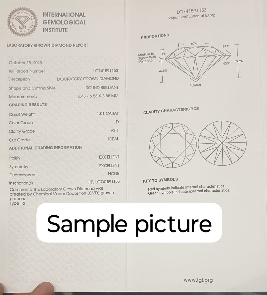 π 1 Ct Lab-Grown CVD Diamond β D Color Oval Brilliant Cut IGI Certified Gemstone π This stunning 1 Carat Lab-Grown CVD Diamond shines with exceptional brilliance and unmatched purity. Graded D Color , it represents the highest color gradeβicy white, radiant, and incredibly rare in both natural and lab diamonds. The Oval Brilliant Cut enhances fire, sparkle, and finger coverage, making it ideal for high-end engagement rings, luxury pendants, or designer custom settings. IGI certification ensures true quality and transparency, giving you full confidence in every detail. β¨ Gemstone Details: Gem Type: Lab-Grown CVD Diamond Weight: 1.00 Carat Color Grade: D Cut: Oval Brilliant Cut Clarity: High Grade (As per IGI) Treatment: Lab Created Certification: IGI Certified π Key Highlights: Premium D Color βrare, bright & icy white Oval Brilliant Cut with maximum sparkle IGI Certified for precision, grading & authenticity Sustainable lab-grown CVD diamond Ideal for engagement rings, fine jewelry & luxury designs π Perfect For: Engagement Rings β’ Wedding Jewelry β’ Custom Designs β’ High-End Gifts π¦ SHIPPING & DELIVERY β±οΈ Handling Time: 1β2 Business Days π Estimated Delivery: 10β15 Days (Varies by Location) π 30-DAY RETURN POLICY β BUY WITH CONFIDENCE We offer a 30-Day Hassle-Free Return Policy . Return the item in its original condition if you're not fully satisfied. π€ YOUR SATISFACTION MATTERS π¬ Contact us anytime for support, questions, or custom requests. We're available 24/7 to provide fast and friendly service. π οΈ CUSTOM ORDERS WELCOME π© Reach out to Gemoracrafts β Experts in handcrafted luxury design. ποΈ ABOUT GEMORACRAFTS Gemoracrafts is your trusted source for rare, certified gemstones and bespoke jewelry solutions . Every gem is carefully selected for quality, authenticity, and long-term value.