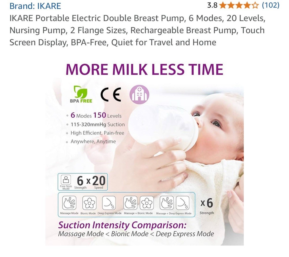 The IKARE Pain Free Portable Breast Pump is a double electric breast pump designed for convenient and efficient milk production. This hospital-grade pump comes in a 16-piece set with adjustable settings to fit your needs. The clear color and sleek design make it both functional and stylish. With features like being BPA free and portable, this pump allows for easy use and flexibility for new moms on the go.New open box