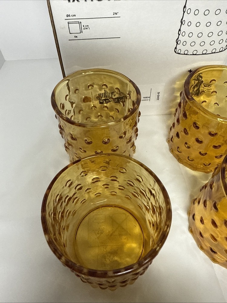 Original box, box does have some writing on it. The IKEA HUTLOS 4 Hobnail Amber Glass Votive Tea Light Candle Holders are a set of retro-style candle holders suitable for all occasions. Made of small-sized round glass with a shiny finish and textured hobnail pattern, these 2.5" holders are perfect for mini candles. Care instructions recommend cleaning with a damp cloth or warm water, and they come in a pack of 4. Ideal for indoor use in any room, these candle holders are a stylish and practical addition to your decor.