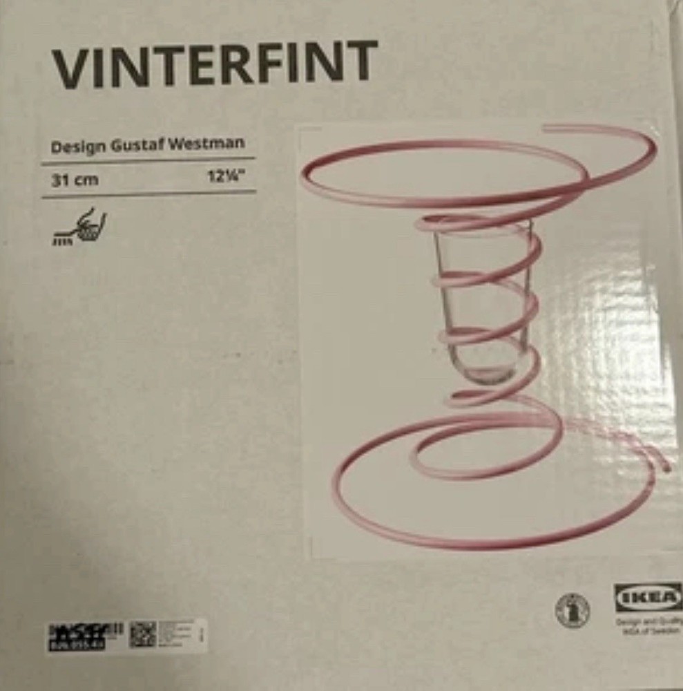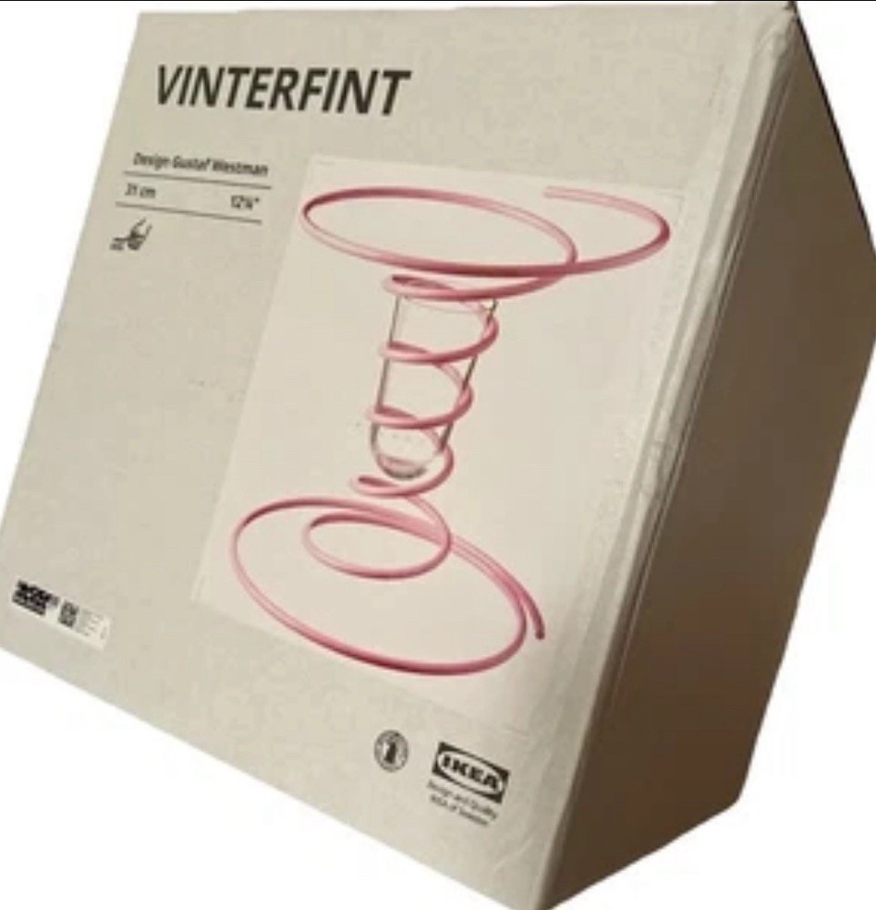 IKEA x Gustaf Westman VINTERFINT Vase Pink New In Box Limited Edition SOLD OUT The thin, light-pink metal spiral that embraces the softly rounded glass makes Gustaf Westman's VINTERFINT vase a captivating object on its own. Add flowers to make the impression even more striking. Materials Base: Steel, Epoxy/polyester powder coating Vase: Glass Wipe dry with a clean cloth. Handwash only. Designer: Gustaf Westman Article Number 806.055.43