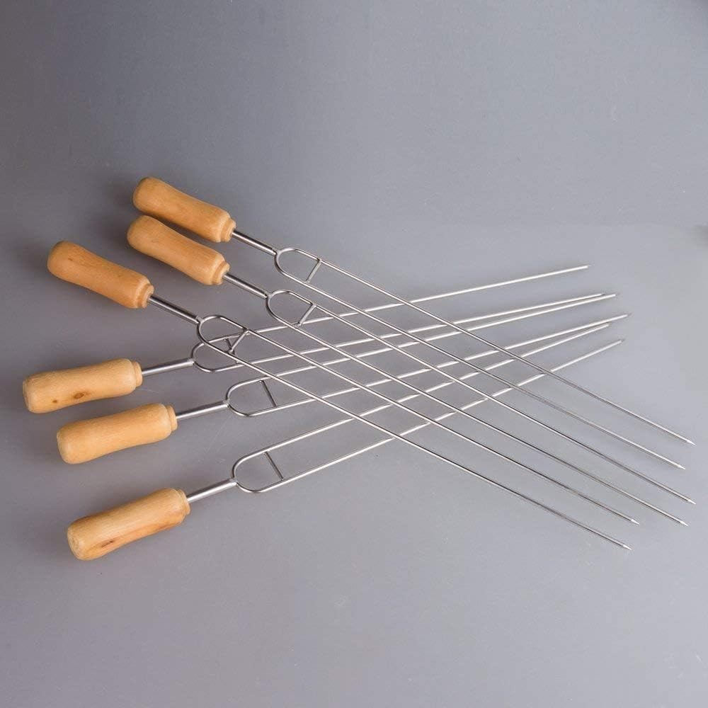 IMEEA Double Pronged Skewers for Grilling Stainless Steel 6-Piece, Silver Product Details Material: Stainless Steel Color: Silver Item Length: 15.3 Inches Brand: IMEEA Item Weight: 0.35 Kilograms Number of Pieces: 6 Item Weight: 12.3 ounces Manufacturer: IMEEA Item model number: A239 Is Discontinued By Manufacturer: No Double Prongs: These well made barbecue skewers that have double prongs which means you can rotate them and all skewered items rotate without slippage. No more carefully checking each item is cooking as intended. Wooden Handle: Double prong skewers with wooden handle will keep your fingers from being burned and make them super easy to place, turn, and remove from the grill without needing tongs. Multi Usage: Our double prong bbq skewers are suitable for small pieces of shish kabob, chicken wings, meat, beef, lamb, kofta, kebab, koobideh, shrimp, prawn shashlik. vegetables: mushrooms, bell peppers, onions, cucumber, roma tomatoes, potatoes, etc. Material: These 15.3-Inch stainless steel grill skewers are made of high quality stainless steel has high hardness and good thermal conductivity. Our shish kabob skewers are reusable, easy to clean. Dimensions: Total Length: 15.3inch/38.8cm, Roast Needle Length: 12.7inch/32cm, Handle Length: 2.6inch/6.8cm. Great for camping, indoor grilling, outdoor BBQ or any other places you love.