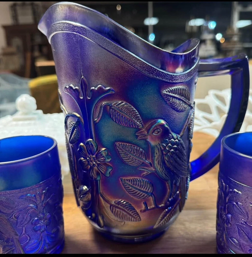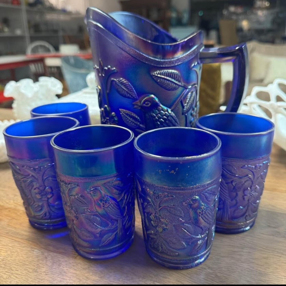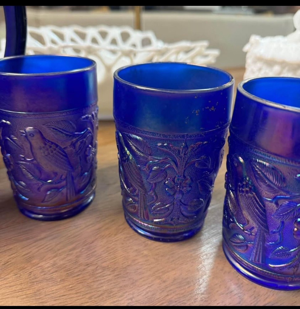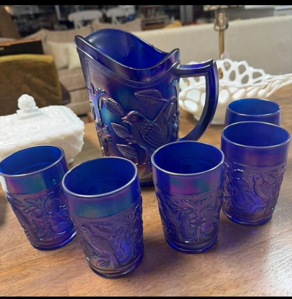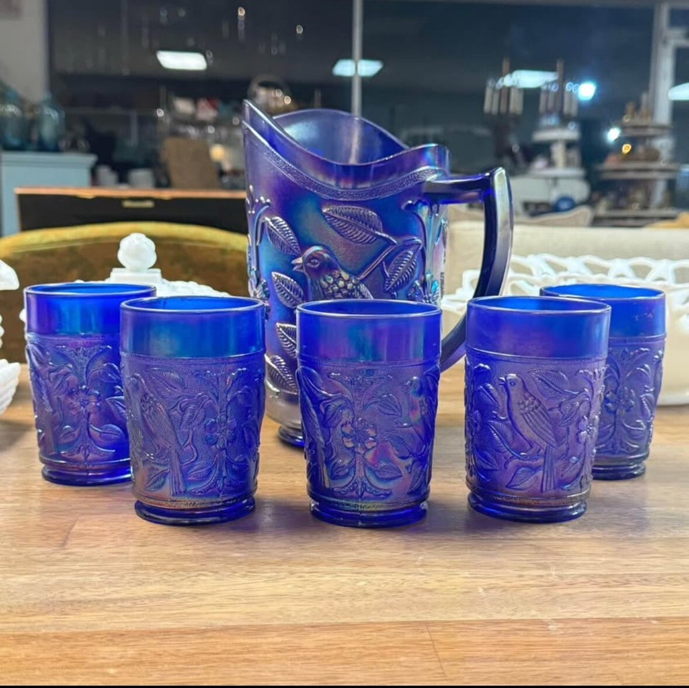 Imperial Glass Cobalt Blue Carnival Robins Water Set includes a pitcher and tumbler glasses. Made of vintage glass by Imperial Glass in the 1940s, this decorative set features a pattern of robins in a deep blue color. Suitable for all occasions, this tumbler glass set appeals to teens and unisex adults alike.