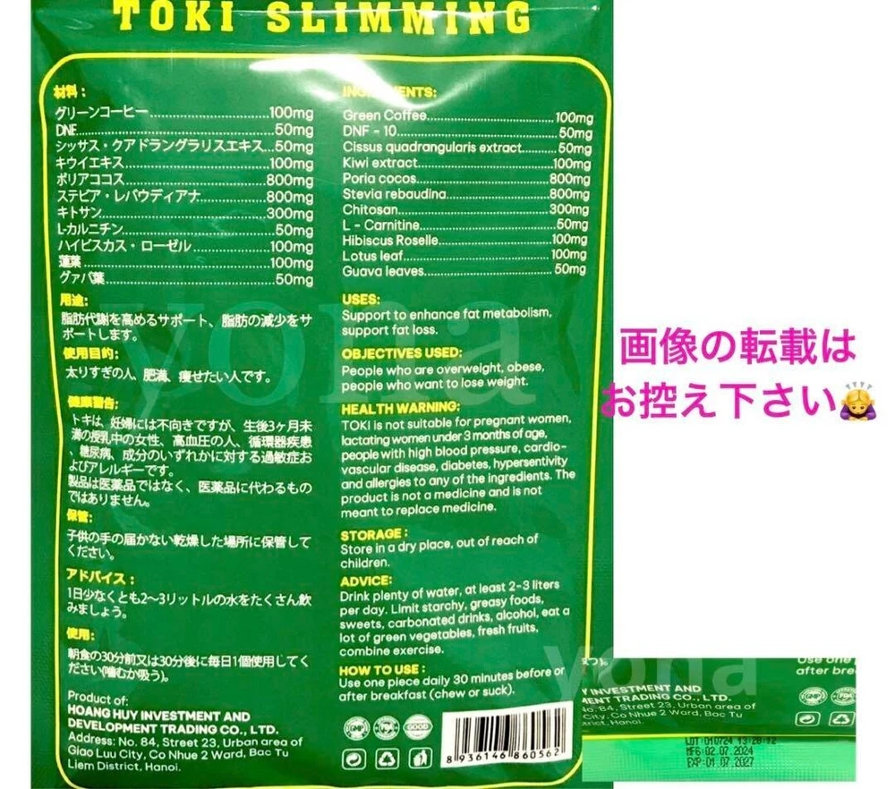 TOKI SLIMMING CANDY 15 pieces Diet food Kiwi flavor Set of 3packs FROM JAPAN Description IN STOCK,We will try to ship as soon as possible. Condition NEW Shipping We always send the item with a tracking number. So please place an order without any concern on delivery. You can always track the delivery status. Shipping is only available to the address registered in eBay. If you want us to send another address, please change your address on eBay and then place an order. Shipping is available from Monday to Friday. Weekends are not available because freight (shipping) companies are closed. We do not mark merchandise values below value or mark items as ?gifts? ? Japan, US and International government regulations prohibit such behavior. About Importer's Obligation Import duties, taxes, and charges are not included in the item price or shipping cost. These charges are the buyer's responsibility. Please check with your country's customs office to determine what these additional costs will be prior to bidding or buying. Thank you for your understanding.