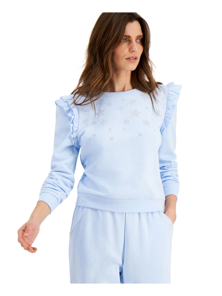 This sweatshirt is so cute and comfy! The light blue color is perfect for spring, and the ruffled embellishments add a stylish touch. Even though it was a display item, it looks brand new and fits great. The cotton blend is soft and cozy, making it ideal for casual outings. Love the relaxed fit—definitely worth it!